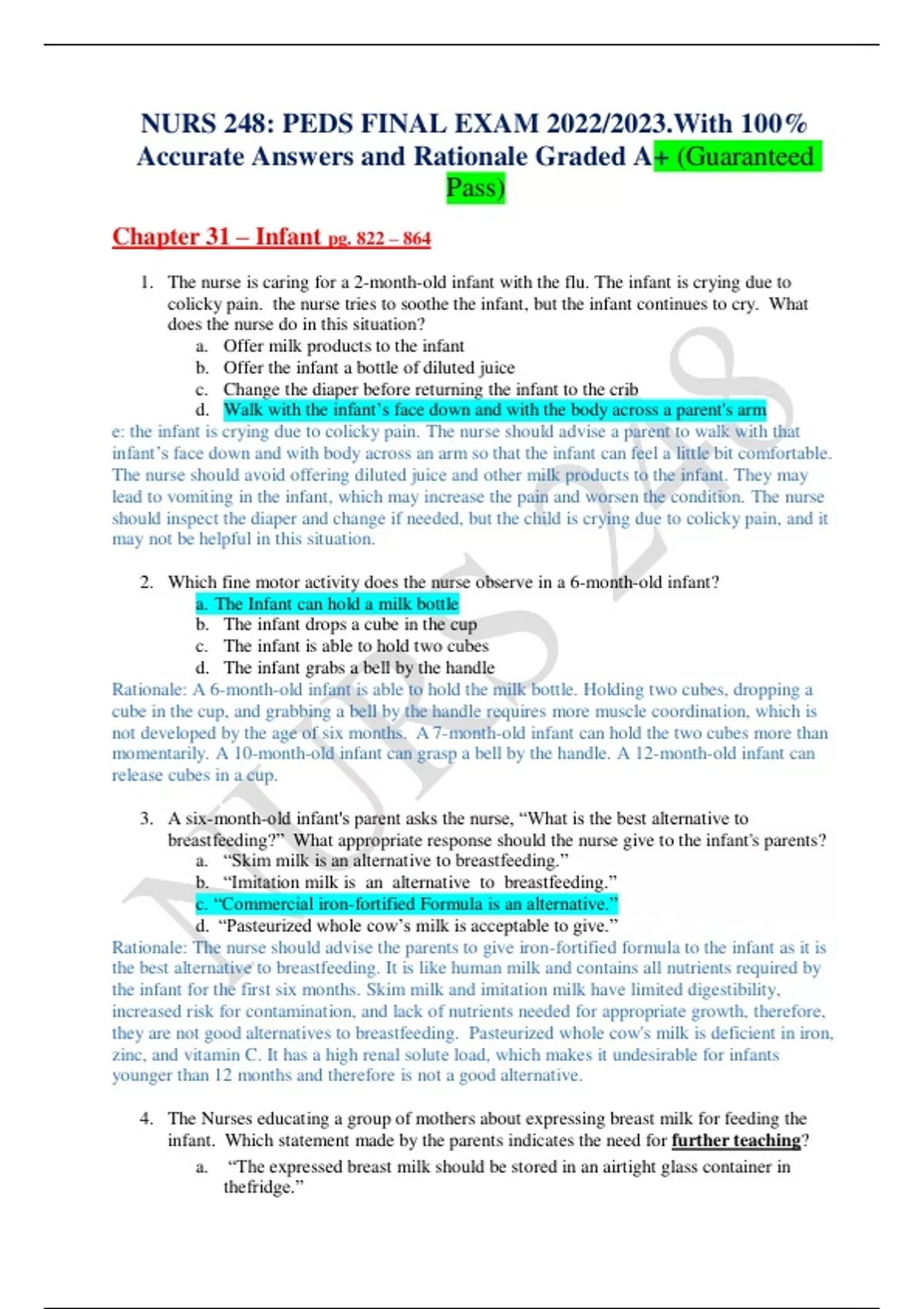 NURS 248: PEDS FINAL EXAM 2022/2023.With 100% Accurate Answers and Rationale Graded A+ (Guaranteed Pass) Chapter 31 – Infant pg. 822 – 864 1. The nurse is caring for a 2-month-old infant with the flu. The infant is crying due to colicky pain. the nurse tries to soothe the infant, but the infant continues to cry. What does the nurse do in this situation? a. Offer milk products to the infant b. Offer the infant a bottle of diluted juice c. Change the diaper before returning the infant to the crib d. Walk with the infant’s face down and with the body across a parent's arm e: the infant is crying due to colicky pain. The nurse should advise a parent to walk with that infant’s face down and with body across an arm so that the infant can feel a little bit comfortable. The nurse should avoid offering diluted juice and other milk products to the infant. They may lead to vomiting in the infant, which may increase the pain and worsen the condition. The nurse should inspect the diaper and change if needed, but the child is crying due to colicky pain, and it may not be helpful in this situation. 2. Which fine motor activity does the nurse observe in a 6-month-old infant? a. The Infant can hold a milk bottle b. The infant drops a cube in the cup c. The infant is able to hold two cubes d. The infant grabs a bell by the handle Rationale: A 6-month-old infant is able to hold the milk bottle. Holding two cubes, dropping a cube in the cup, and grabbing a bell by the handle requires more muscle coordination, which is not developed by the age of six months. A 7-month-old infant can hold the two cubes more than momentarily. A 10-month-old infant can grasp a bell by the handle. A 12-month-old infant can release cubes in a cup. 3. A six-month-old infant's parent asks the nurse, “What is the best alternative to breastfeeding?” What appropriate response should the nurse give to the infant's parents? a. “Skim milk is an alternative to breastfeeding.” b. “Imitation milk is an alternative to breastfeeding.” c. “Commercial iron-fortified Formula is an alternative.” d. “Pasteurized whole cow’s milk is acceptable to give.” Rationale: The nurse should advise the parents to give iron-fortified formula to the infant as it is the best alternative to breastfeeding. It is like human milk and contains all nutrients required by the infant for the first six months. Skim milk and imitation milk have limited digestibility, increased risk for contamination, and lack of nutrients needed for appropriate growth, therefore, they are not good alternatives to breastfeeding. Pasteurized whole cow's milk is deficient in iron, zinc, and vitamin C. It has a high renal solute load, which makes it undesirable for infants younger than 12 months and therefore is not a good alternative.