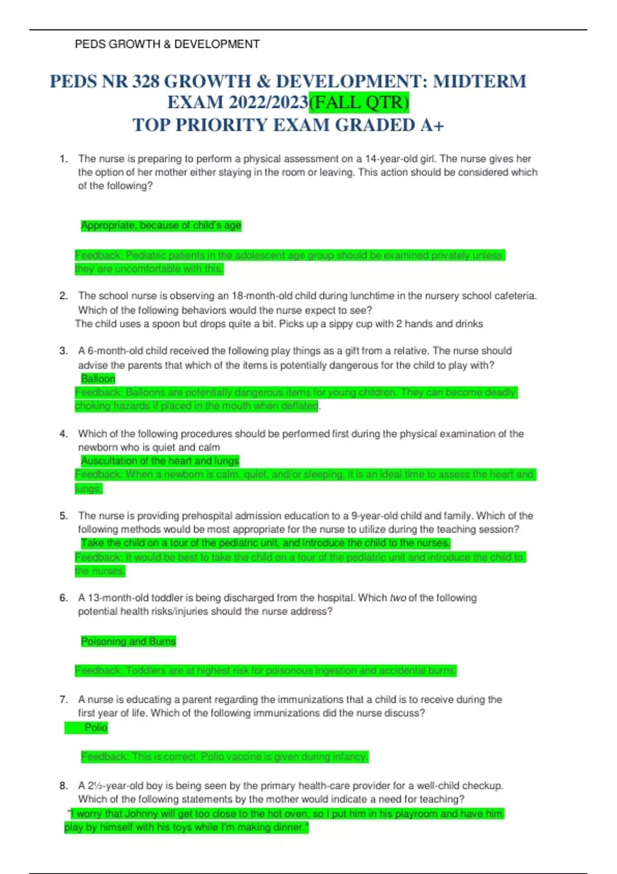 PEDS NR 328 GROWTH & DEVELOPMENT: MIDTERM EXAM 2022/2023(FALL QTR) TOP PRIORITY EXAM GRADED A+