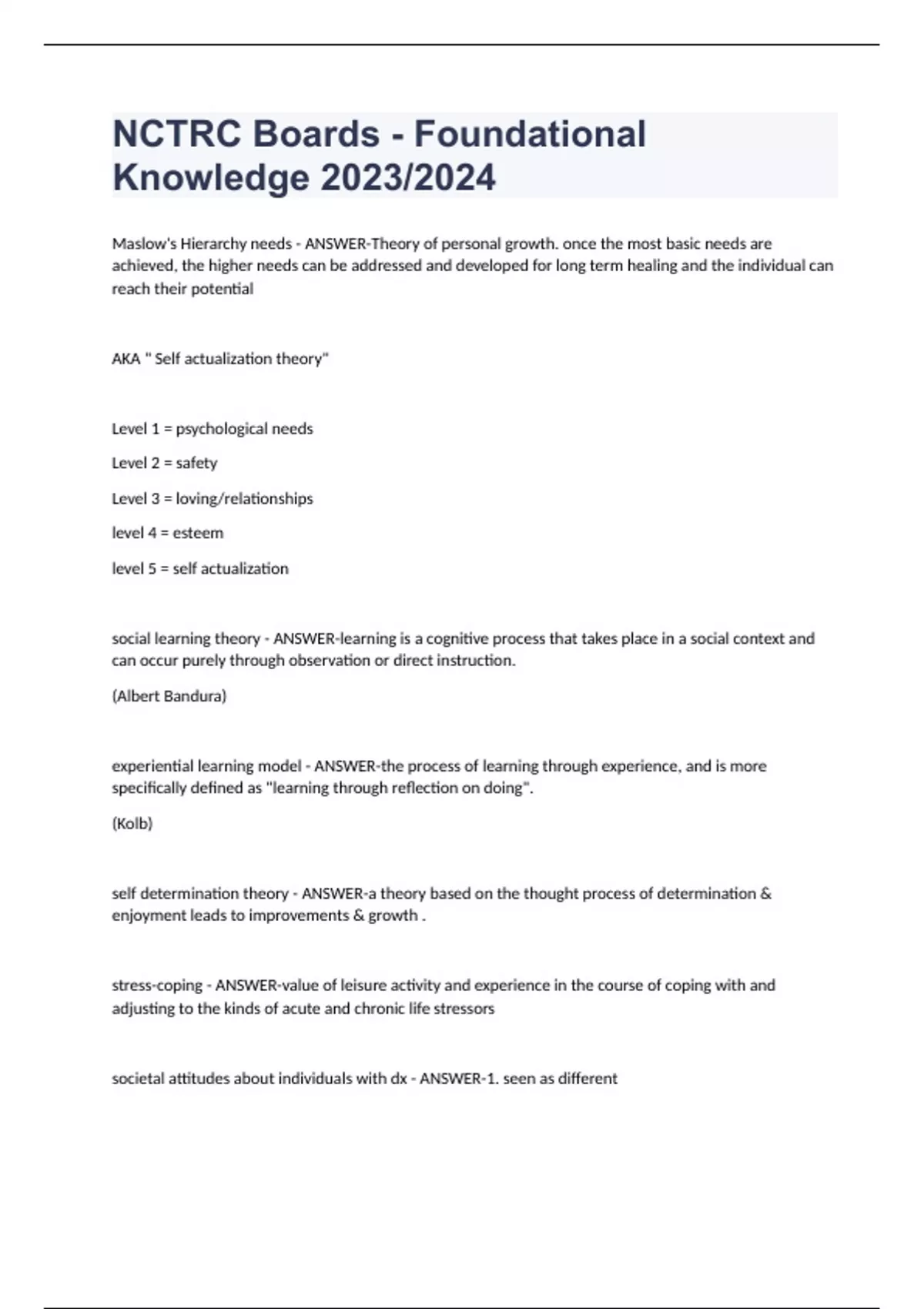 NCTRC Boards - Foundational Knowledge 2023/2024 Maslow's Hierarchy needs - ANSWER-Theory of personal growth. once the most basic needs are achieved, the higher needs can be addressed and developed for long term healing and the individual can reach their potential AKA " Self actualization theory" Level 1 = psychological needs Level 2 = safety Level 3 = loving/relationships level 4 = esteem level 5 = self actualization social learning theory - ANSWER-learning is a cognitive process that takes place in a social context and can occur purely through observation or direct instruction. (Albert Bandura) experiential learning model - ANSWER-the process of learning through experience, and is more specifically defined as "learning through reflection on doing". (Kolb) self determination theory - ANSWER-a theory based on the thought process of determination & enjoyment leads to improvements & growth . stress-coping - ANSWER-value of leisure activity and experience in the course of coping with and adjusting to the kinds of acute and chronic life stressors societal attitudes about individuals with dx - ANSWER-1. seen as different