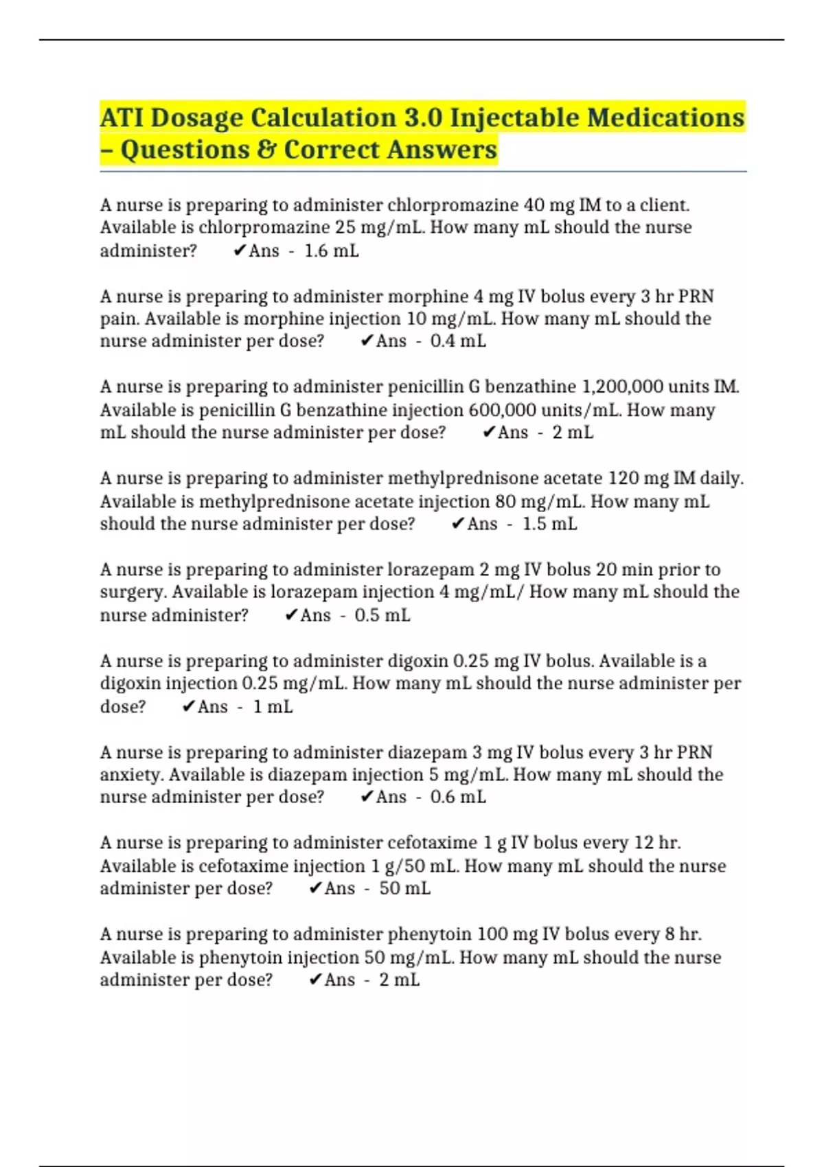 ATI Dosage Calculation 3.0 Injectable Medications – Questions & Correct Answers