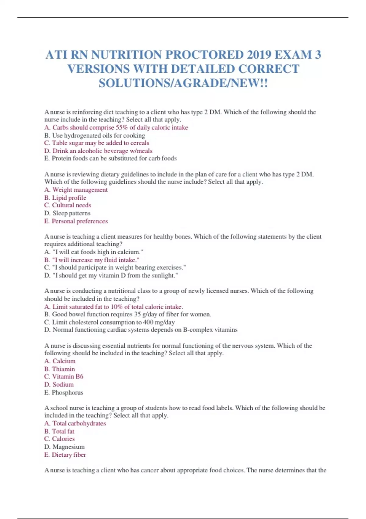 ATI RN NUTRITION PROCTORED 2019 EXAM 3 VERSIONS WITH DETAILED CORRECT SOLUTIONS/AGRADE/NEW!!