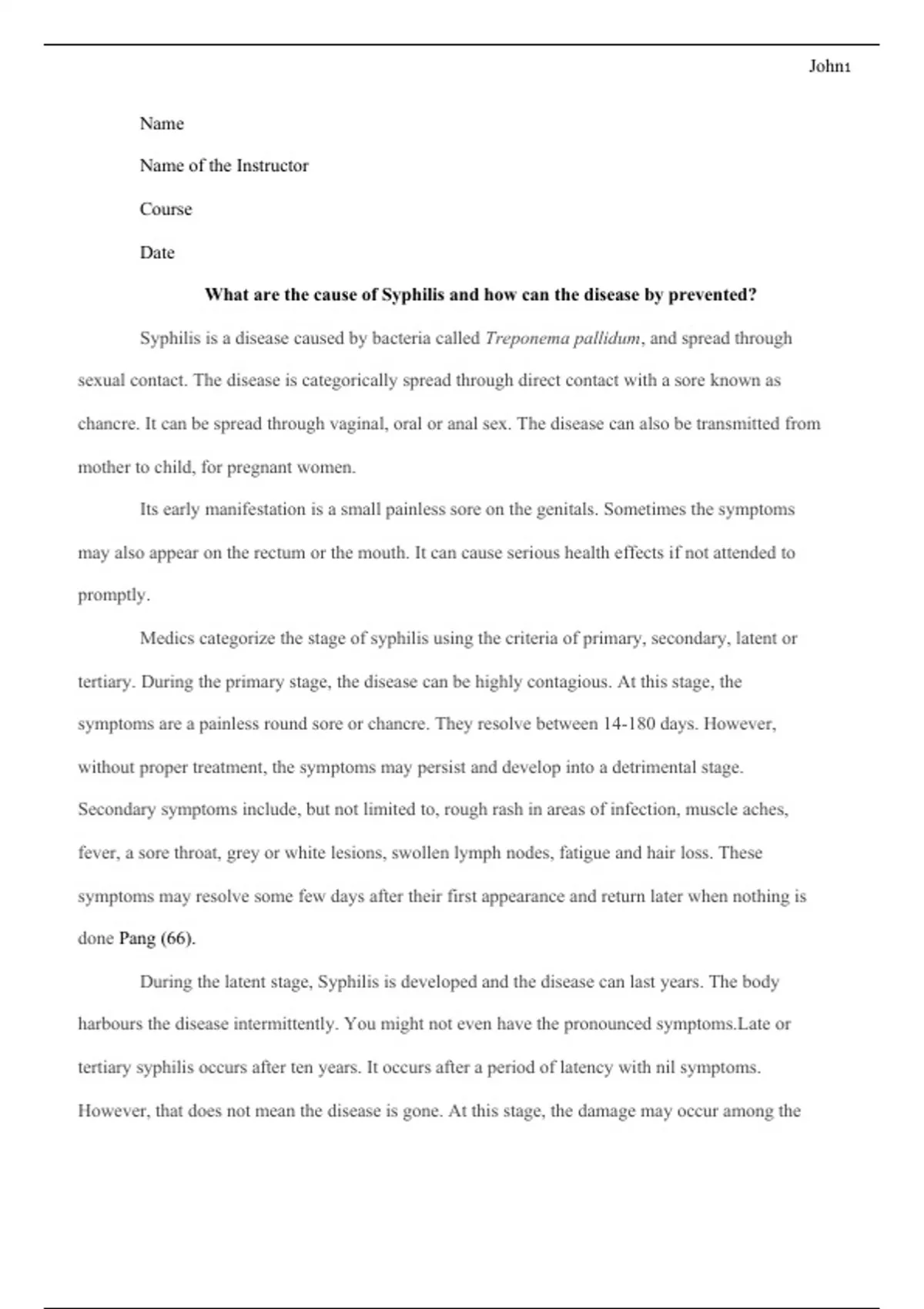 The document describes causes, impacts, treatment and preventive measures for Syphilis.