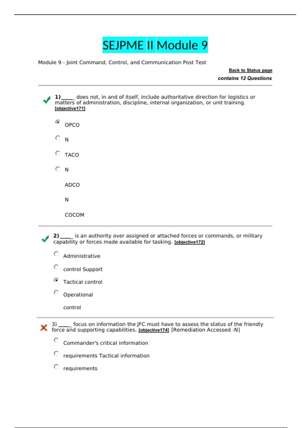 SEJPME II Module 9 Module 9 - Joint Command, Control, and Communication Post Test Back to Status page contains 12 Questions 1) _ does not, in and of itself, include authoritative direction for logistics or matters of administration, discipline, internal organization, or unit training. [objective171] OPCON TACON ADCON COCOM 2) _ is an authority over assigned or attached forces or commands, or military capability or forces made available for tasking. [objective172] Administrative control Support Tactical control Operational control 3) _ focus on information the JFC must have to assess the status of the friendly force and supporting capabilities. [objective174] [Remediation Accessed :N] Commander's critical information requirements Tactical information requirements Friendly force information requirements Priority intelligence requirements 4) The _ stage of the commander's decision cycle is facilitated by the commander's intent; CCIRs also assist the JTF HQ in this role. [objective175]