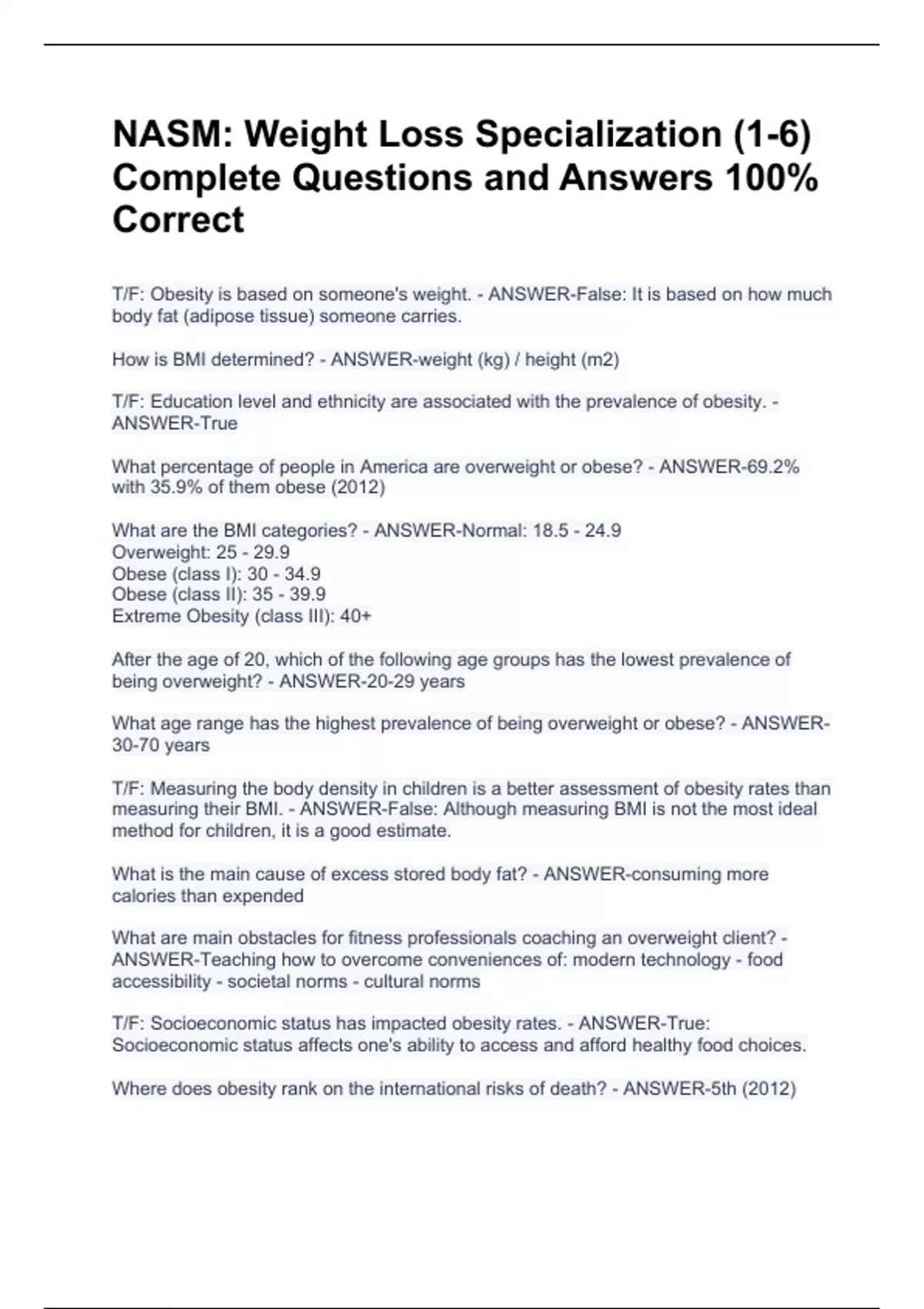 NASM: Weight Loss Specialization (1-6) Complete Questions and Answers 100% CorrectNASM: Weight Loss Specialization (1-6) Complete Questions and Answers 100% CorrectNASM: Weight Loss Specialization (1-6) Complete Questions and Answers 100% Correct T/F: Obesity is based on someone's weight. - ANSWER-False: It is based on how much body fat (adipose tissue) someone carries. How is BMI determined? - ANSWER-weight (kg) / height (m2) T/F: Education level and ethnicity are associated with the prevalence of obesity. - ANSWER-True What percentage of people in America are overweight or obese? - ANSWER-69.2% with 35.9% of them obese (2012) What are the BMI categories? - ANSWER-Normal: 18.5 - 24.9 Overweight: 25 - 29.9 Obese (class I): 30 - 34.9 Obese (class II): 35 - 39.9 Extreme Obesity (class III): 40+ After the age of 20, which of the following age groups has the lowest prevalence of being overweight? - ANSWER-20-29 years What age range has the highest prevalence of being overweight or obese? - ANSWER-30-70 years T/F: Measuring the body density in children is a better assessment of obesity rates than measuring their BMI. - ANSWER-False: Although measuring BMI is not the most ideal
