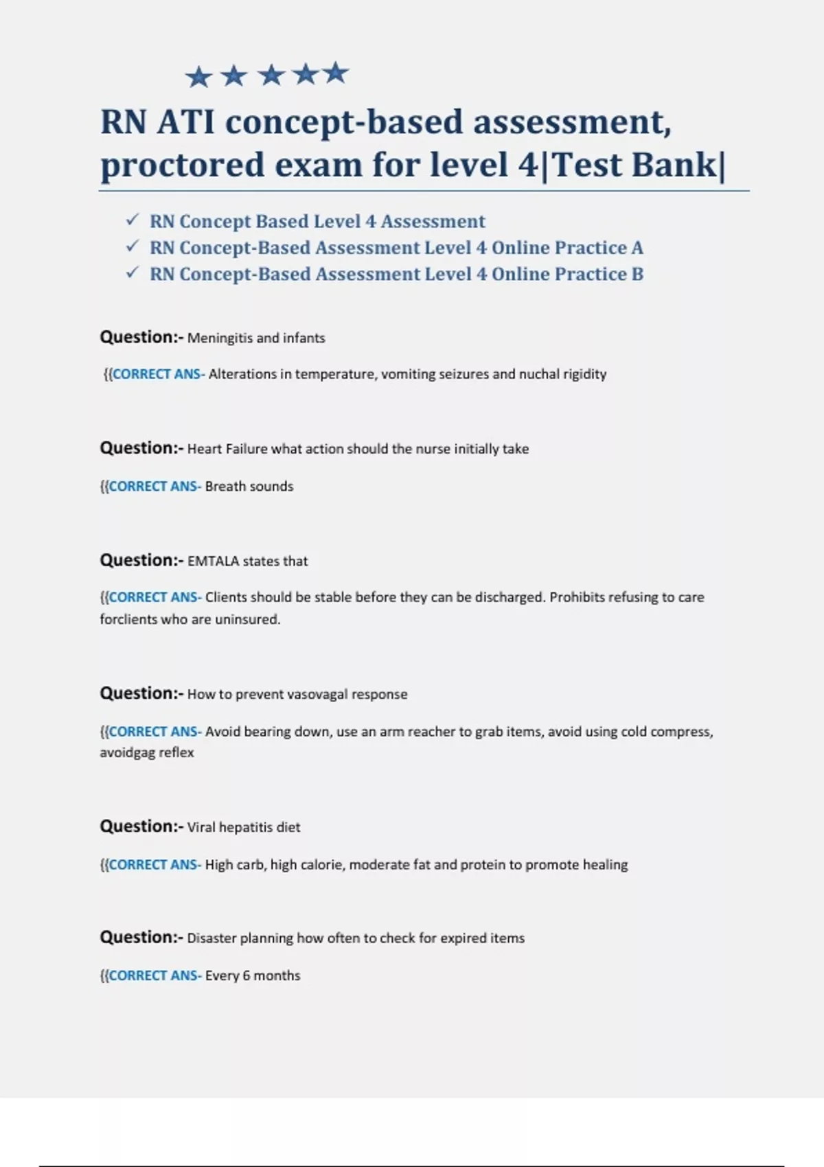 RN ATI Concept-Based Assessment, Proctored Exam for Level 4 With Online Practice A & B Verified Answers 2023 Question:- Meningitis and infants {{Correct Ans- Alterations in temperature, vomiting seizures and nuchal rigidity Question:- Heart Failure what action should the nurse initially take {{Correct Ans- Breath sounds