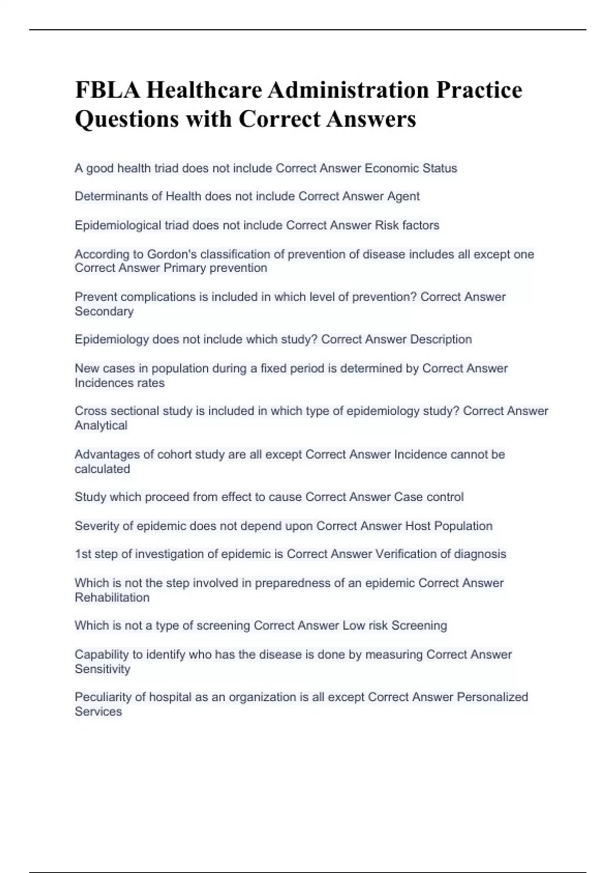 FBLA Healthcare Administration Practice Questions with Correct Answers