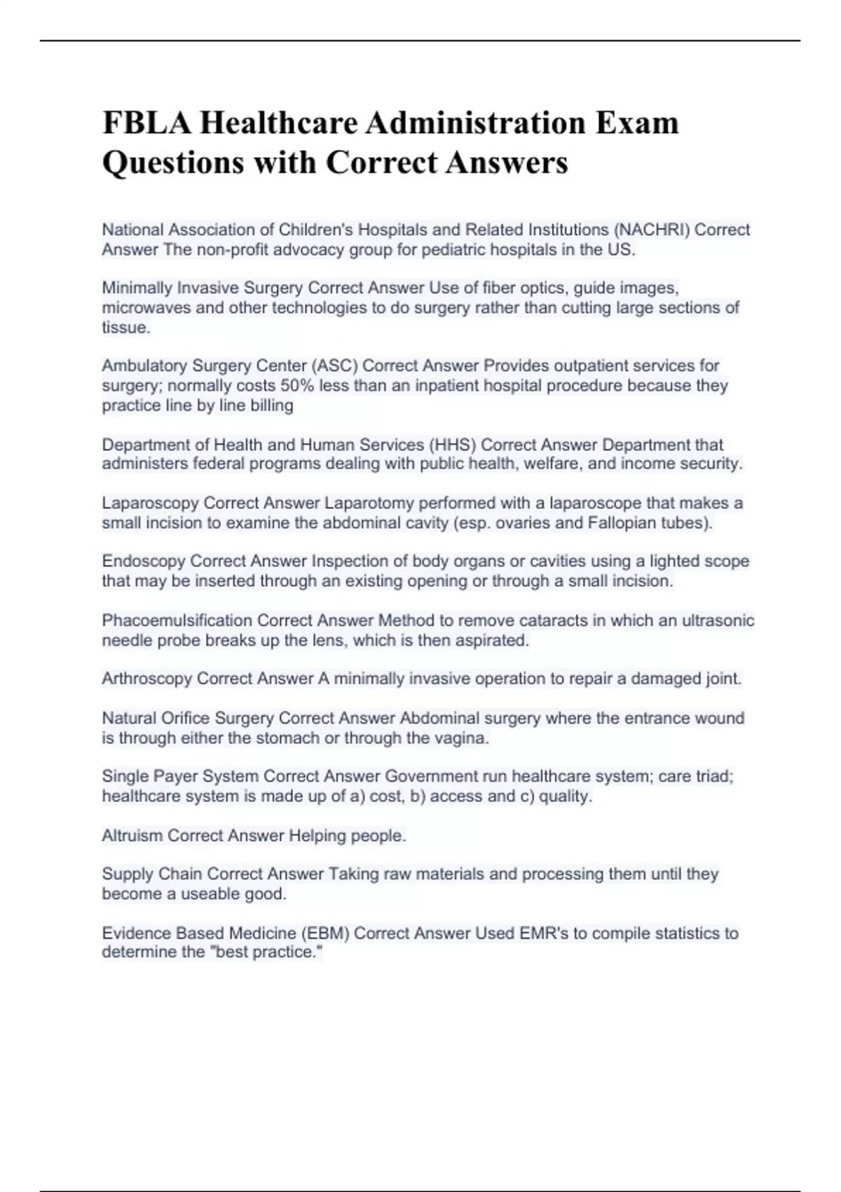 National Association of Children's Hospitals and Related Institutions (NACHRI) Correct Answer The non-profit advocacy group for pediatric hospitals in the US. Minimally Invasive Surgery Correct Answer Use of fiber optics, guide images, microwaves and other technologies to do surgery rather than cutting large sections of tissue. Ambulatory Surgery Center (ASC) Correct Answer Provides outpatient services for surgery; normally costs 50% less than an inpatient hospital procedure because they practice line by line billing Department of Health and Human Services (HHS) Correct Answer Department that administers federal programs dealing with public health, welfare, and income security. Laparoscopy Correct Answer Laparotomy performed with a laparoscope that makes a small incision to examine the abdominal cavity (esp. ovaries and Fallopian tubes). Endoscopy Correct Answer Inspection of body organs or cavities using a lighted scope that may be inserted through an existing opening or through a small incision. Phacoemulsification Correct Answer Method to remove cataracts in which an ultrasonic needle probe breaks up the lens, which is then aspirated. Arthroscopy Correct Answer A minimally invasive operation to repair a damaged joint. Natural Orifice Surgery Correct Answer Abdominal surgery where the entrance wound is through either the stomach or through the vagina. Single Payer System Correct Answer Government run healthcare system; care triad; healthcare system is made up of a) cost, b) access and c) quality. Altruism Correct Answer Helping people. Supply Chain Correct Answer Taking raw materials and processing them until they become a useable good. Evidence Based Medicine (EBM) Correct Answer Used EMR's to compile statistics to determine the "best practice."
