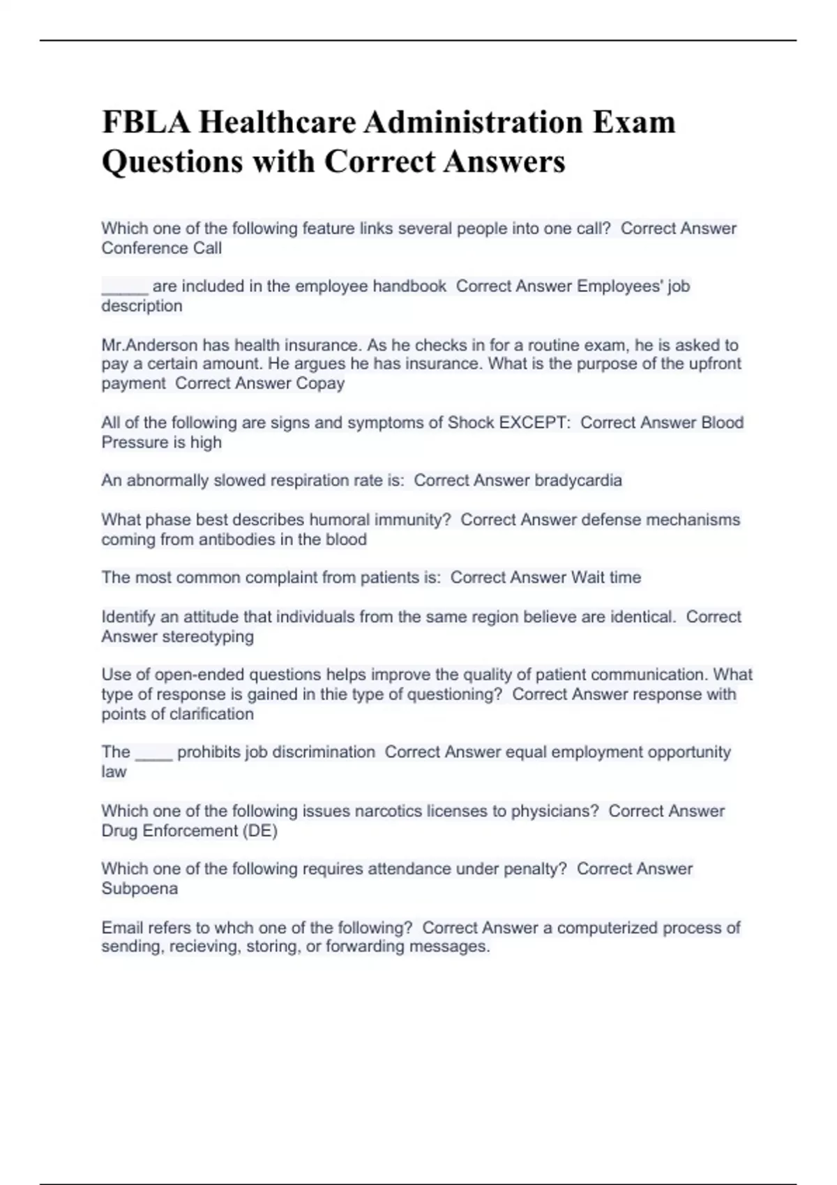 FBLA Healthcare Administration Exam Questions with Correct Answers