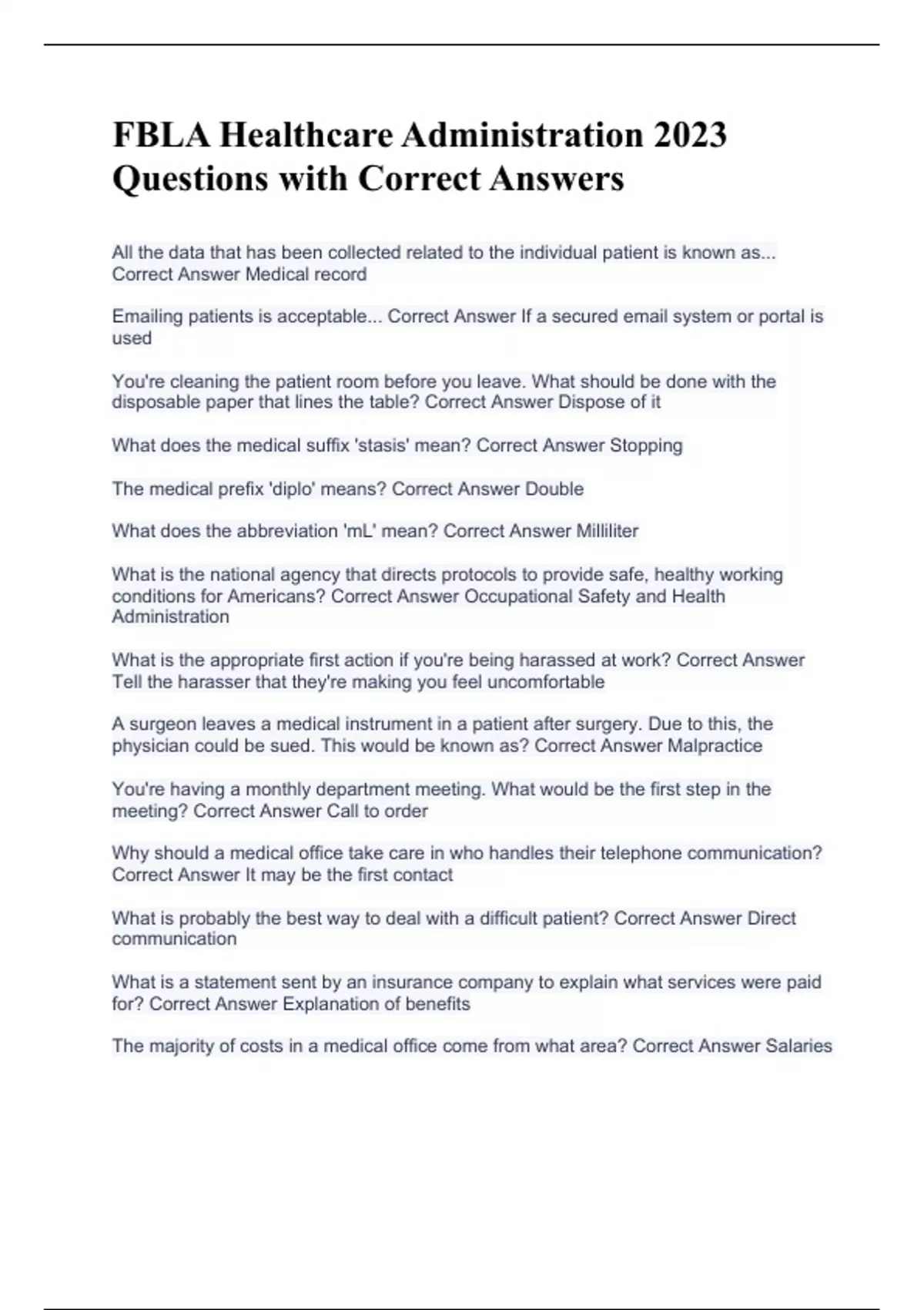 FBLA Healthcare Administration 2023 Questions with Correct Answers