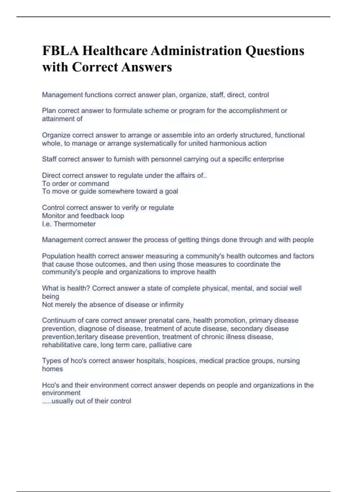 Management functions correct answer plan, organize, staff, direct, control Plan correct answer to formulate scheme or program for the accomplishment or attainment of Organize correct answer to arrange or assemble into an orderly structured, functional whole, to manage or arrange systematically for united harmonious action Staff correct answer to furnish with personnel carrying out a specific enterprise Direct correct answer to regulate under the affairs of.. To order or command To move or guide somewhere toward a goal Control correct answer to verify or regulate Monitor and feedback loop I.e. Thermometer Management correct answer the process of getting things done through and with people Population health correct answer measuring a community's health outcomes and factors that cause those outcomes, and then using those measures to coordinate the community's people and organizations to improve health What is health? Correct answer a state of complete physical, mental, and social well being Not merely the absence of disease or infirmity Continuum of care correct answer prenatal care, health promotion, primary disease prevention, diagnose of disease, treatment of acute disease, secondary disease prevention,teritary disease prevention, treatment of chronic illness disease, rehabilitative care, long term care, palliative care Types of hco's correct answer hospitals, hospices, medical practice groups, nursing homes Hco's and their environment correct answer depends on people and organizations in the environment .....usually out of their control