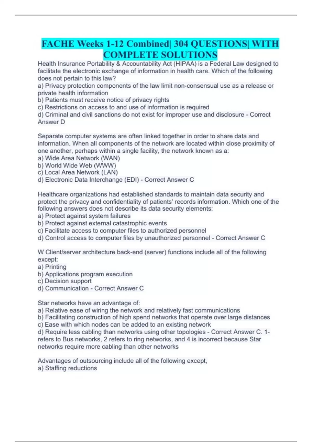Health Insurance Portability & Accountability Act (HIPAA) is a Federal Law designed to facilitate the electronic exchange of information in health care. Which of the following does not pertain to this law? a) Privacy protection components of the law limit non-consensual use as a release or private health information b) Patients must receive notice of privacy rights c) Restrictions on access to and use of information is required d) Criminal and civil sanctions do not exist for improper use and disclosure - Correct Answer D Separate computer systems are often linked together in order to share data and information. When all components of the network are located within close proximity of one another, perhaps within a single facility, the network known as a: a) Wide Area Network (WAN) b) World Wide Web (WWW) c) Local Area Network (LAN) d) Electronic Data Interchange (EDI) - Correct Answer C Healthcare organizations had established standards to maintain data security and protect the privacy and confidentiality of patients' records information. Which one of the following answers does not describe its data security elements: a) Protect against system failures b) Protect against external catastrophic events c) Facilitate access to computer files to authorized personnel d) Control access to computer files by unauthorized personnel - Correct Answer C W Client/server architecture back-end (server) functions include all of the following except: a) Printing b) Applications program execution c) Decision support d) Communication - Correct Answer C Star networks have an advantage of: a) Relative ease of wiring the network and relatively fast communications b) Facilitating construction of high spend networks that operate over large distances c) Ease with which nodes can be added to an existing network d) Require less cabling than networks using other topologies - Correct Answer C. 1-refers to Bus networks, 2 refers to ring networks, and 4 is incorrect because Star networks require more cabling than other networks Advantages of outsourcing include all of the following except, a) Staffing reductions b) Increased implementation time