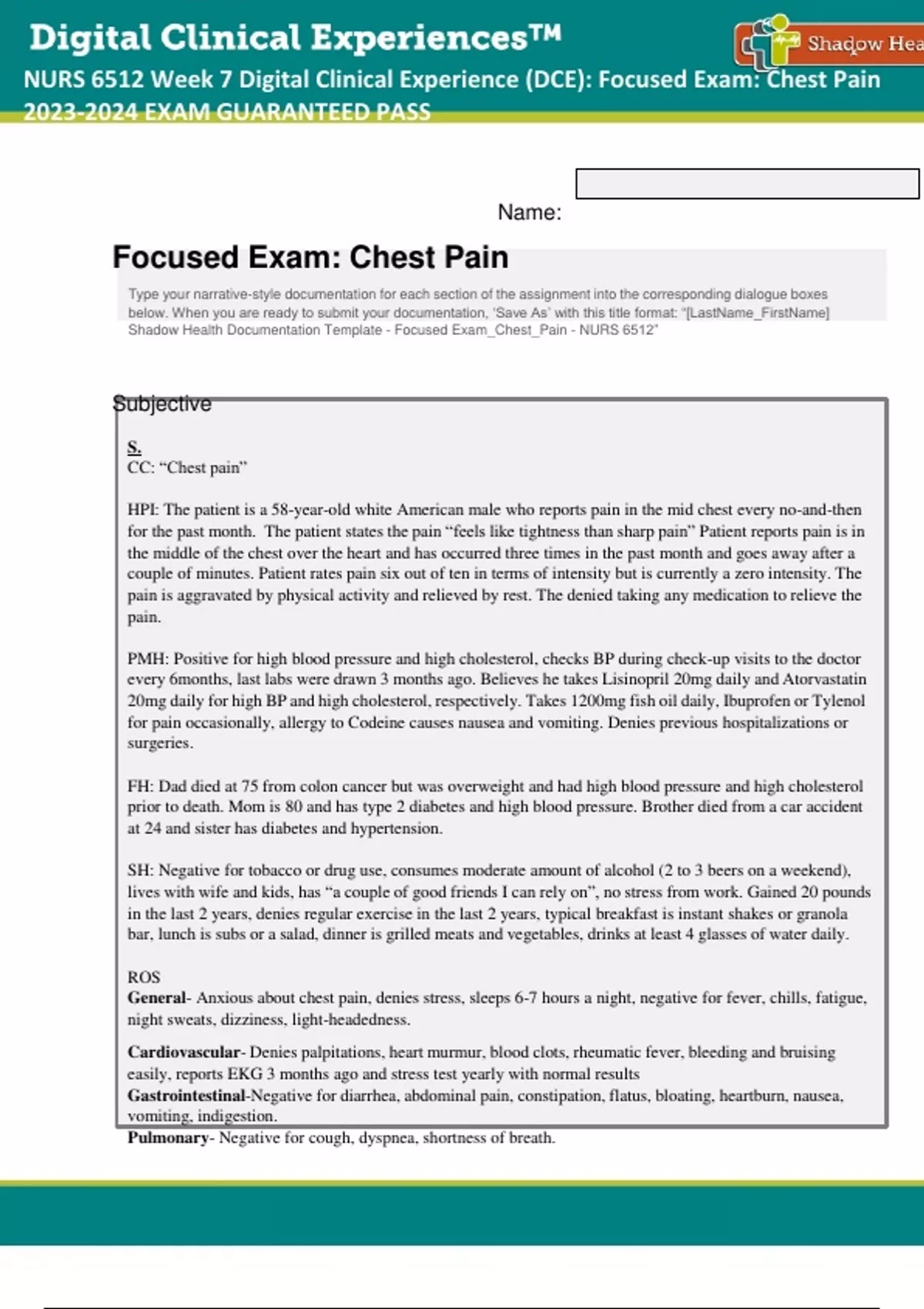 NURS 6512N Week 7 Digital Clinical Experience (DCE) Focused Exam Chest Pain UPDATED