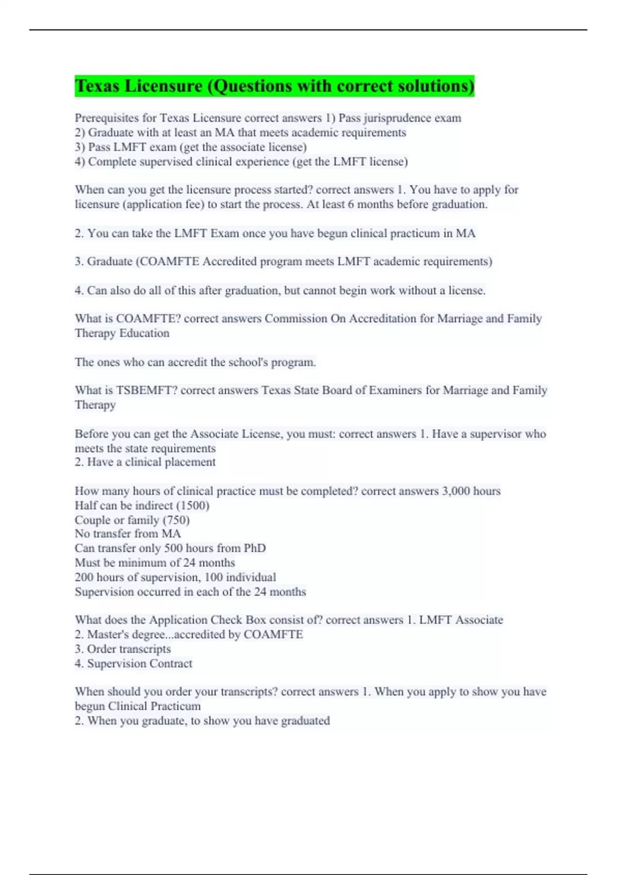 Prerequisites for Texas Licensure correct answers 1) Pass jurisprudence exam 2) Graduate with at least an MA that meets academic requirements 3) Pass LMFT exam (get the associate license) 4) Complete supervised clinical experience (get the LMFT license) When can you get the licensure process started? correct answers 1. You have to apply for licensure (application fee) to start the process. At least 6 months before graduation. 2. You can take the LMFT Exam once you have begun clinical practicum in MA 3. Graduate (COAMFTE Accredited program meets LMFT academic requirements) 4. Can also do all of this after graduation, but cannot begin work without a license. What is COAMFTE? correct answers Commission On Accreditation for Marriage and Family Therapy Education The ones who can accredit the school's program. What is TSBEMFT? correct answers Texas State Board of Examiners for Marriage and Family Therapy Before you can get the Associate License, you must: correct answers 1. Have a supervisor who meets the state requirements 2. Have a clinical placement How many hours of clinical practice must be completed? correct answers 3,000 hours Half can be indirect (1500) Couple or family (750) No transfer from MA Can transfer only 500 hours from PhD Must be minimum of 24 months 200 hours of supervision, 100 individual Supervision occurred in each of the 24 months What does the Application Check Box consist of? correct answers 1. LMFT Associate 2. Master's degree...accredited by COAMFTE 3. Order transcripts 4. Supervision Contract When should you order your transcripts? correct answers 1. When you apply to show you have begun Clinical Practicum 2. When you graduate, to show you have graduated