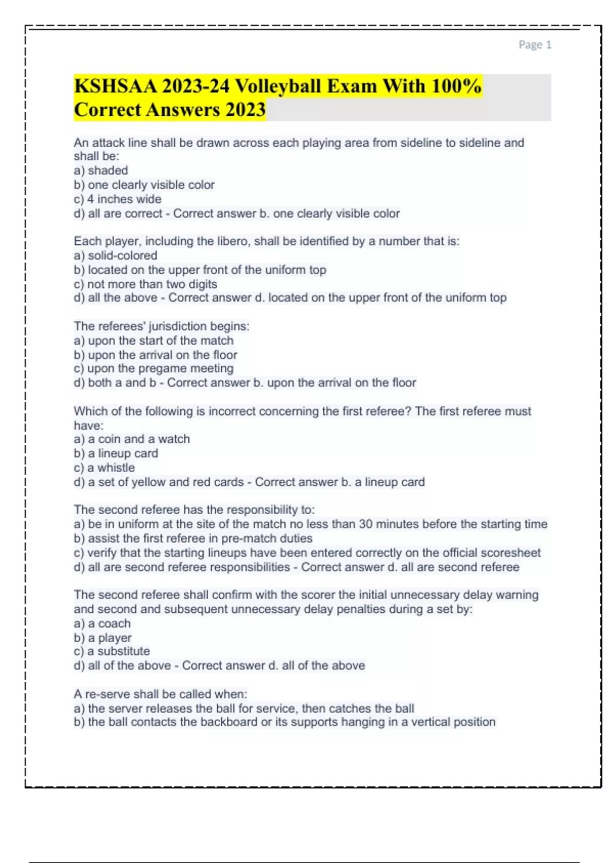 KSHSAA 2023-24 Volleyball Exam With 100% Correct Answers 2023 KSHSAA 2023-24 Volleyball Exam With 100% Correct Answers 2023