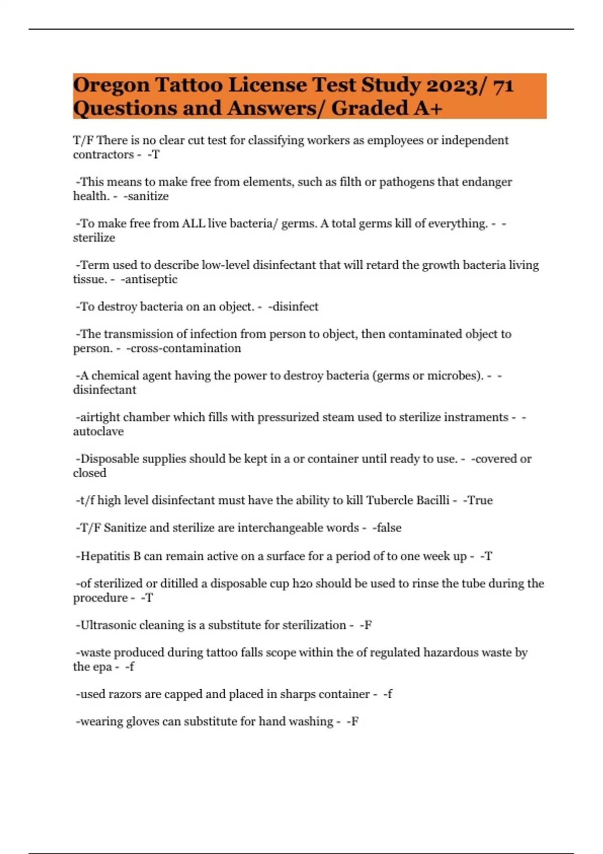 Oregon Tattoo License Test Study 2023/ 71 Questions and Answers/ Graded A+