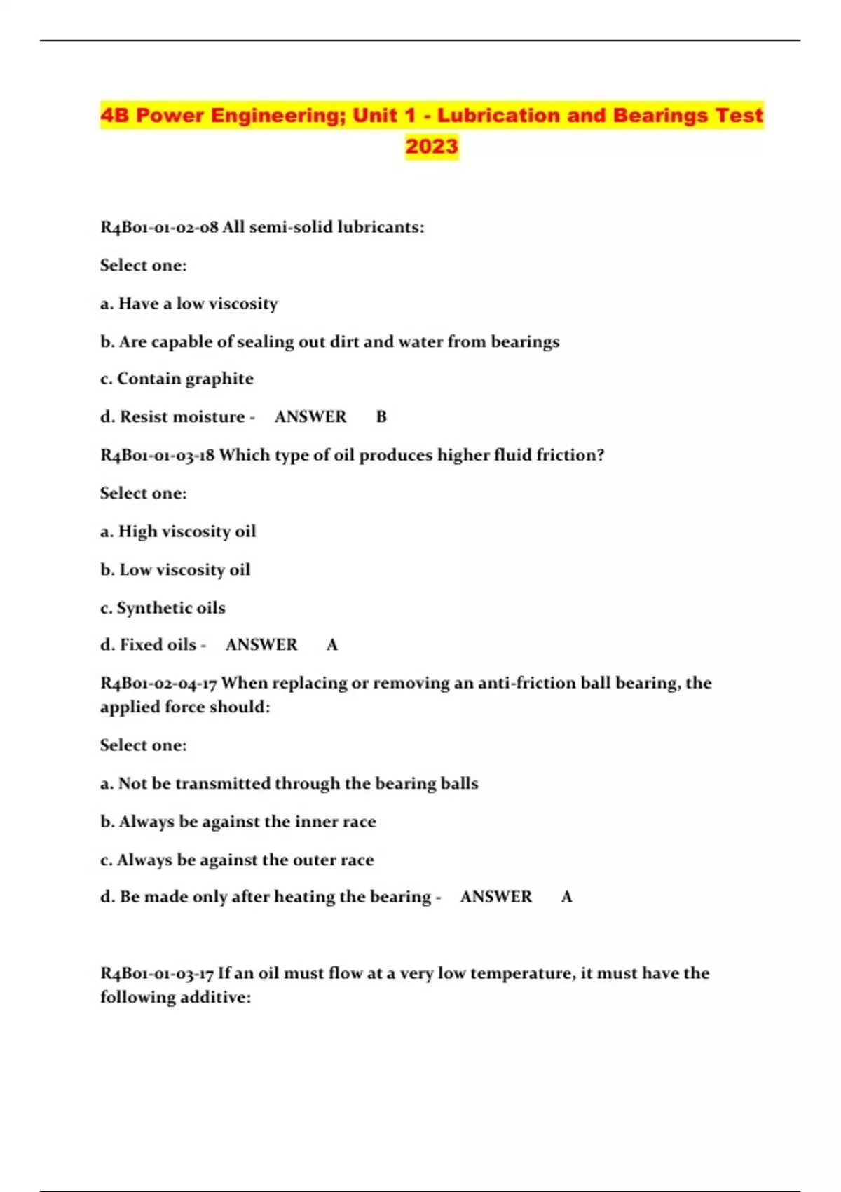 4B Power Engineering; Unit 1 - Lubrication and Bearings Test 2023...