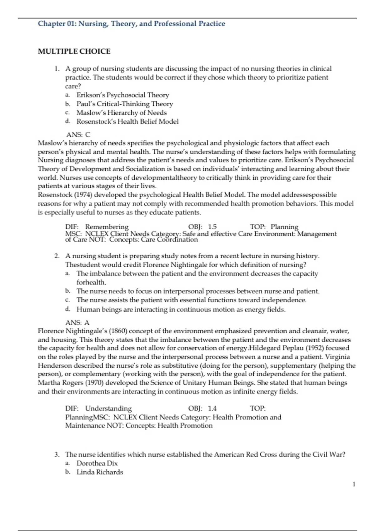Test Bank Fundamentals of Nursing 2nd Edition Yoost Chapter 01: Nursing, Theory, and Professional Practice MULTIPLE CHOICE 1. A group of nursing students are discussing the impact of no nursing theories in clinical practice. The students would be correct if they chose which theory to prioritize patient care? a. Erikson’s Psychosocial Theory b. Paul’s Critical-Thinking Theory c. Maslow’s Hierarchy of Needs d. Rosenstock’s Health Belief Model ANS: C Maslow’s hierarchy of needs specifies the psychological and physiologic factors that affect each person’s physical and mental health. The nurse’s understanding of these factors helps with formulating Nursing diagnoses that address the patient’s needs and values to prioritize care. Erikson’s Psychosocial Theory of Development and Socialization is based on individuals’ interacting and learning about their world. Nurses use concepts of developmental theory to critically think in providing care for their patients at various stages of their lives. Rosenstock (1974) developed the psychological Health Belief Model. The model addresses possible reasons for why a patient may not comply with recommended health promotion behaviors. This model is especially useful to nurses as they educate patients. DIF: Remembering OBJ: 1.5 TOP: Planning MSC: NCLEX Client Needs Category: Safe and effective Care Environment: Management of Care NOT: Concepts: Care Coordination 2. A nursing student is preparing study notes from a recent lecture in nursing history. The student would credit Florence Nightingale for which definition of nursing? a. The imbalance between the patient and the environment decreases the capacity for health. b. The nurse needs to focus on interpersonal processes between nurse and patient. c. The nurse assists the patient with essential functions toward independence. d. Human beings are interacting in continuous motion as energy fields. ANS: A Florence Nightingale’s (1860) concept of the environment emphasized prevention and clean air, water, and housing. This theory states that the imbalance between the patient and the environment decreases the capacity for health and does not allow for conservation of energy. Hildegard Peplau (1952) focused on the roles played by the nurse and the interpersonal process between a nurse and a patient. Virginia Henderson described the nurse’s role as substitutive (doing for the person), supplementary (helping the person), or complementary (working with the person), with the goal of independence for the patient. Martha Rogers (1970) developed the Science of Unitary Human Beings. She stated that human beings and their environments are interacting in continuous motion as infinite energy fields. DIF: Understanding OBJ: 1.4 TOP: Planning MSC: NCLEX Client Needs Category: Health Promotion and Maintenance NOT: Concepts: Health Promotion 3. The nurse identifies which nurse established the American Red Cross during the Civil War? a. Dorothea Dix b. Linda Richards 1c. Lena Higbee d. Clara Barton ANS: D Clara Barton practiced nursing in the Civil War and established the American Red Cross. Dorothea Dix was the head of the U.S. Sanitary Commission, which was a forerunner of the Army Nurse Corps. Linda Richards was America’s first trained nurse, graduating from Boston’s Women’s Hospital in 1873, and Lena Higbee, superintendent of the U.S. Navy Nurse Corps, was awarded the Navy Cross in 1918. DIF: Remembering OBJ: 1.3 TOP: Assessment MSC: NCLEX Client Needs Category: Health Promotion and Maintenance NOT: Concepts: Professionalism 4. The nursing instructor is researching the five proficiencies regarded as essential for students and professionals. The nursing instructor identifies which organization would be found to have added safety as a sixth competency? a. Quality and Safety Education for Nurses (QSEN) b. Institute of Medicine (IOM) c. American Association of Colleges of Nursing (AACN) d. National League for Nursing (NLN) ANS: A The Institute of Medicine report, Health Professions Education: A Bridge to Quality (2003), outlines five core competencies. These include patient-centered care, interdisciplinary teamwork, use of evidence-based medicine, quality improvement, and use of information technology. QSEN added safety as a sixth competency. The Essentials of Baccalaureate Education for Professional Nursing Practice are provided and updated by the American Association of Colleges of Nursing (AACN) (2008). The document offers a framework for the education of professional nurses with outcomes for students to meet. The National League for Nursing (NLN) outlines and updates competencies for practical, associate, baccalaureate, and graduate nursing education programs. DIF: Remembering OBJ: 1.1 TOP: Planning MSC: NCLEX Client Needs Category: Safe and Effective Care Environment: Management of Care NOT: Concepts: Care Coordination 5. The nurse manager is interviewing graduate nurses to fill existing staffing vacancies. When hiring graduate nurses, the nurse manager realizes that they will probably not be considered “competent” until they complete which task? a. They graduate and pass NCLEX. b. They have worked 2 to 3 years. c. Their last year of nursing school. d. They are actually hired. ANS: B Benner’s model identifies five levels of proficiency: novice, advanced beginner, competent, proficient, and expert. The student nurse progresses from novice to advanced beginner during nursing school and attains the competent level after approximately 2 to 3 years of work experience after graduation. To obtain the RN credential, a person must graduate from an approved school of nursing and pass a state licensing examination called the National Council Licensure Examination for Registered Nurses (NCLEX-RN) usually taken soon after completion of an approved nursing program. DIF: Remembering OBJ: 1.7 TOP: Planning MSC: NCLEX Client Needs Category: Safe and Effective Care Environment: Management 2of Care NOT: Concept