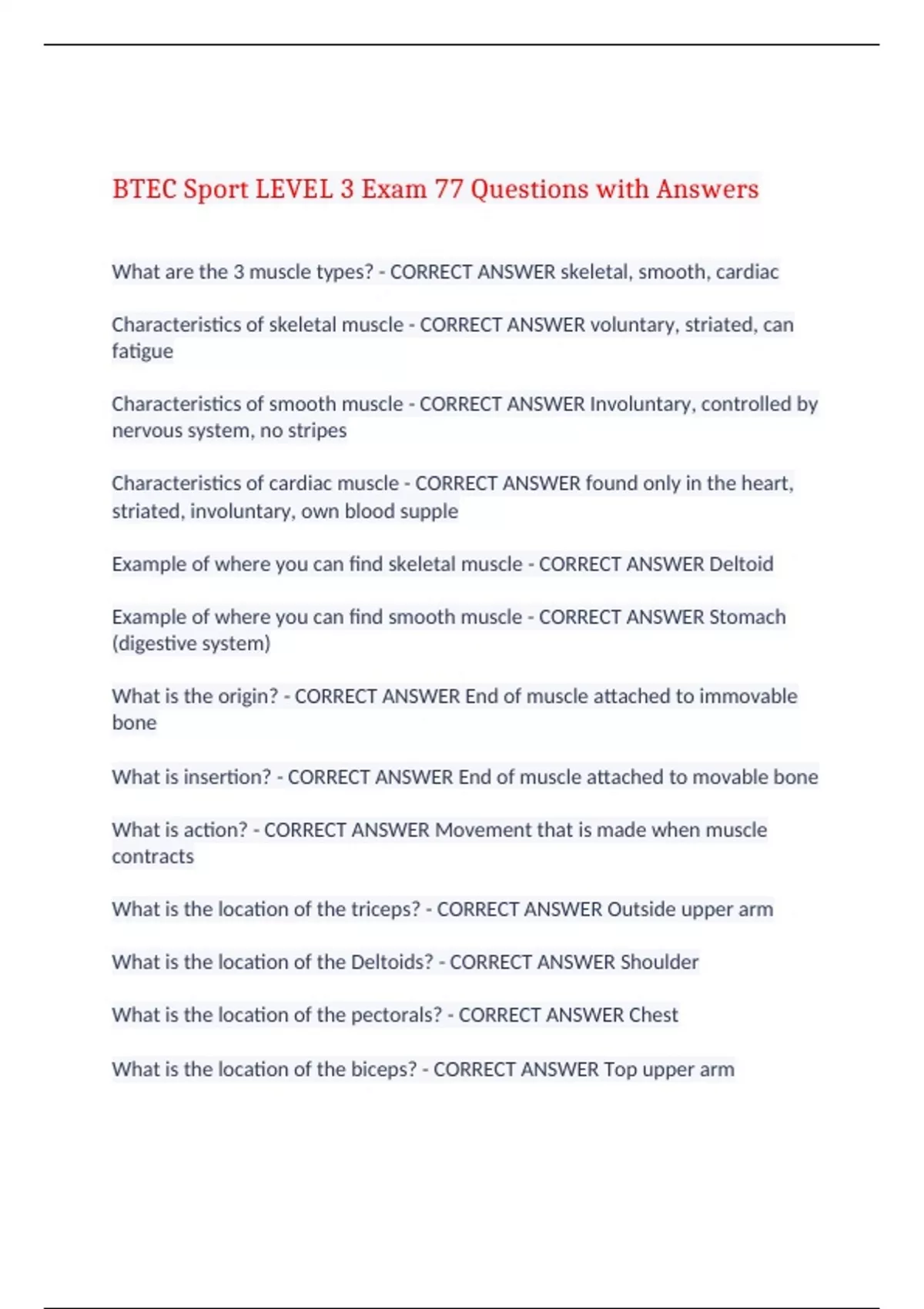 BTEC Sport LEVEL 3 Exam 77 Questions with Answers What are the 3 muscle types? - CORRECT ANSWER skeletal, smooth, cardiac Characteristics of skeletal muscle - CORRECT ANSWER voluntary, striated, can fatigue Characteristics of smooth muscle - CORRECT ANSWER Involuntary, controlled by nervous system, no stripes Characteristics of cardiac muscle - CORRECT ANSWER found only in the heart, striated, involuntary, own blood supple Example of where you can find skeletal muscle - CORRECT ANSWER Deltoid Example of where you can find smooth muscle - CORRECT ANSWER Stomach (digestive system) What is the origin? - CORRECT ANSWER End of muscle attached to immovable bone What is insertion? - CORRECT ANSWER End of muscle attached to movable bone What is action? - CORRECT ANSWER Movement that is made when muscle contracts What is the location of the triceps? - CORRECT ANSWER Outside upper arm What is the location of the Deltoids? - CORRECT ANSWER Shoulder What is the location of the pectorals? - CORRECT ANSWER Chest What is the location of the biceps? - CORRECT ANSWER Top upper arm What is the location of the wrist flexors? - CORRECT ANSWER Inside wrist What is the location of the wrist extensors? - CORRECT ANSWER Outside wrist What is the location of the supinators? - CORRECT ANSWER Inner elbow What is the location of the pronators? - CORRECT ANSWER Inner elbow What is the location of the abdominals? - CORRECT ANSWER Stomach What is the location of the hip flexors? - CORRECT ANSWER Lumbar region of thigh What is the location of the quadriceps? - CORRECT ANSWER Front thigh What is the location of the hamstrings? - CORRECT ANSWER Back thigh What is the location of the gastrocnemius? - CORRECT ANSWER Calf What is the location of the soleus? - CORRECT ANSWER Back of calf What is the location of the tibialis anterior? - CORRECT ANSWER Outside shin What is the location of the erector spinae? - CORRECT ANSWER Centre of back What is the location of the teres major? - CORRECT ANSWER Between scapula and humerus What is the location of the latissimus dorsi? - CORRECT ANSWER Centre at side back What is the location of the obliques? - CORRECT ANSWER Side of torso What is the location of the gluteals? - CORRECT ANSWER Bum What is the function of the triceps? - CORRECT ANSWER Extension of forearm at elbow joint What is the function of the deltoids? - CORRECT ANSWER Stability of shoulder joint and upper arm What is the function of the pectorals? - CORRECT ANSWER flexion, adduction, and internal rotation of the humerus What is the function of the biceps? - CORRECT ANSWER Flexion of elbow and supination of forearm What is the function of the wrist flexors? - CORRECT ANSWER Flexion and abduction of wrist What is the function of the wrist extensors? - CORRECT ANSWER Extends hand at wrist What is the function of the supinators? - CORRECT ANSWER Rotates radius laterally at proximal radioulna joint What is the function of the pronators? - CORRECT ANSWER Exclusive upper limb movement What is the function of the abdominals? - CORRECT ANSWER Allow movement and hold organs in place What is the function of the hip flexors? - CORRECT ANSWER Allow you to move lower body What is the function of the quadriceps? - CORRECT ANSWER Extend leg at knee joint and flex thigh at hip joint What is the function of the hamstrings? - CORRECT ANSWER Allows thigh to extend, tibia to rotate and hip to flex What is the function of the gastrocnemius? - CORRECT ANSWER Plantar flexor of foot and flexes leg at knee What is the function of the soleus? - CORRECT ANSWER Plantar flexion of upper ankle joint enabling lifting of heel What is the function of the erector spinae? - CORRECT ANSWER Move the vertebral column What is the function of the teres major? - CORRECT ANSWER Produce movements of humerus at the glenohumeral joint What is the function of the trapezius? - CORRECT ANSWER Stabilise and move scapula What is the function of the latissimus dorsi? - CORRECT ANSWER Pull inferior angle of scapula in various directions What is the function of the obliques? - CORRECT ANSWER Pull chest downwards and compress abdominal cavity What is the function of the gluteals? - CORRECT ANSWER Extension and external rotation of thigh at hip joint Where do muscles cross and why? - CORRECT ANSWER Cross the joints to allow them to move What do bones act as? - CORRECT ANSWER levers What do joints act as? - CORRECT ANSWER fulcrums What does the strength of muscle contraction depend on? - CORRECT ANSWER Number of muscle fibres needed to be used What do muscles need to contract? - CORRECT ANSWER Oxygen and fuel source (fat or glucose) What do muscles convert chemical energy into? - CORRECT ANSWER Mechanical energy What is the agonist muscle? - CORRECT ANSWER also called prime mover, muscle whose contraction is chiefly responsible for producing a particular movement example: biceps brachii for elbow flexion What is the antagonist muscle? - CORRECT ANSWER Muscle that relaxes during contractions, opposite of agonist, if it doesn't relax no movement can take place What is a synergist muscle? - CORRECT ANSWER Work with agonist to control and direct movement by modifying or altering direction of pull on agonist What is a fixator muscle? - CORRECT ANSWER Stop unwanted movement by fixing or stabilising joints involved in movement What is the antagonist to the bicep? - CORRECT ANSWER Tricep What is the antagonist to the deltoid? - CORRECT ANSWER latissimus dorsi What is the antagonist to the pectoralis major? - CORRECT ANSWER Trapezius What is the antagonist to the rectus abdominus? - CORRECT ANSWER Erector spinae What is the antagonist to the iliopsoas? - CORRECT ANSWER Gluteus maximus What is the antagonist to the quadriceps? - CORRECT ANSWER Hamstrings What is the antagonist to the hip adductor? - CORRECT ANSWER Gluteus medius What is the antagonist to the tibialis anterior? - CORRECT ANSWER Gastrocnemius What are the 3 main types of muscle contraction? - CORRECT ANSWER Concentric, ecc