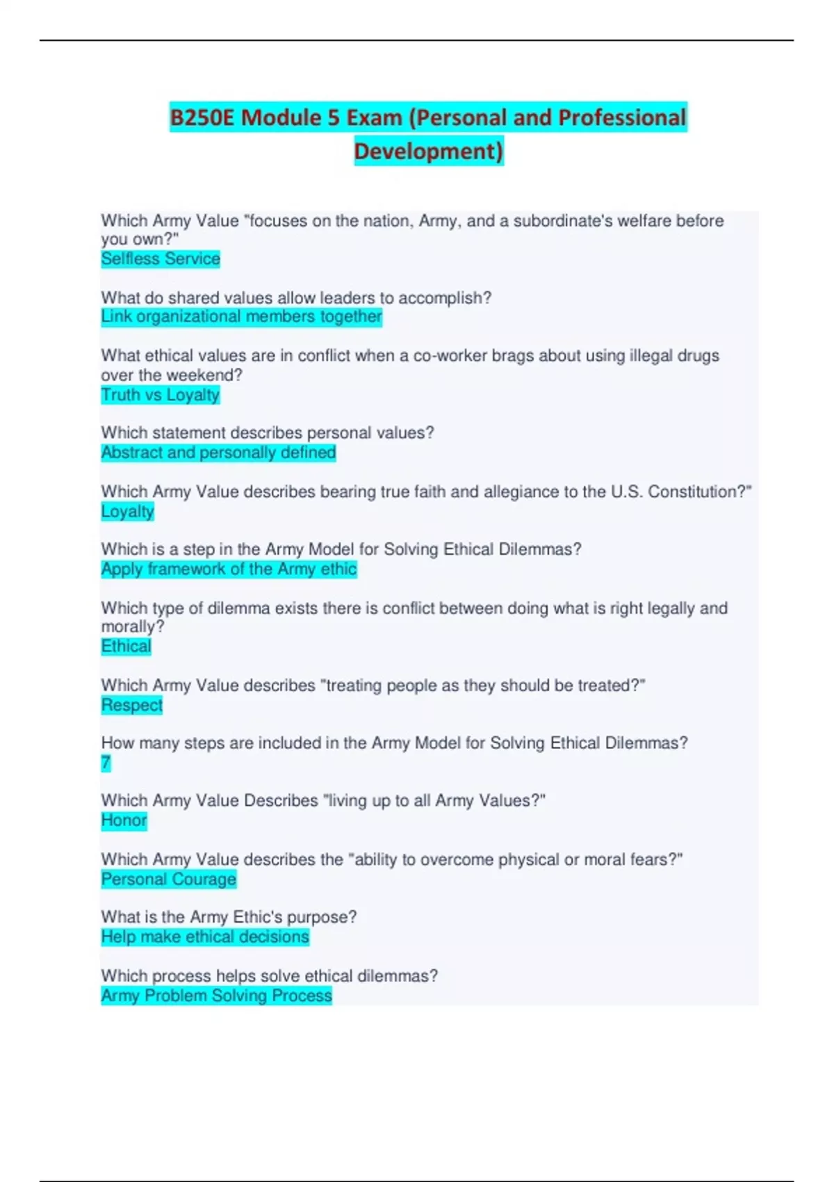 B250E Module 5 Exam (Personal and Professional Development) Which Army Value "focuses on the nation, Army, and a subordinate's welfare before you own?" Selfless Service What do shared values allow leaders to accomplish? Link organizational members together What ethical values are in conflict when a co-worker brags about using illegal drugs over the weekend? Truth vs Loyalty Which statement describes personal values? Abstract and personally defined Which Army Value describes bearing true faith and allegiance to the U.S. Constitution?" Loyalty Which is a step in the Army Model for Solving Ethical Dilemmas? Apply framework of the Army ethic Which type of dilemma exists there is conflict between doing what is right legally and morally? Ethical Which Army Value describes "treating people as they should be treated?"