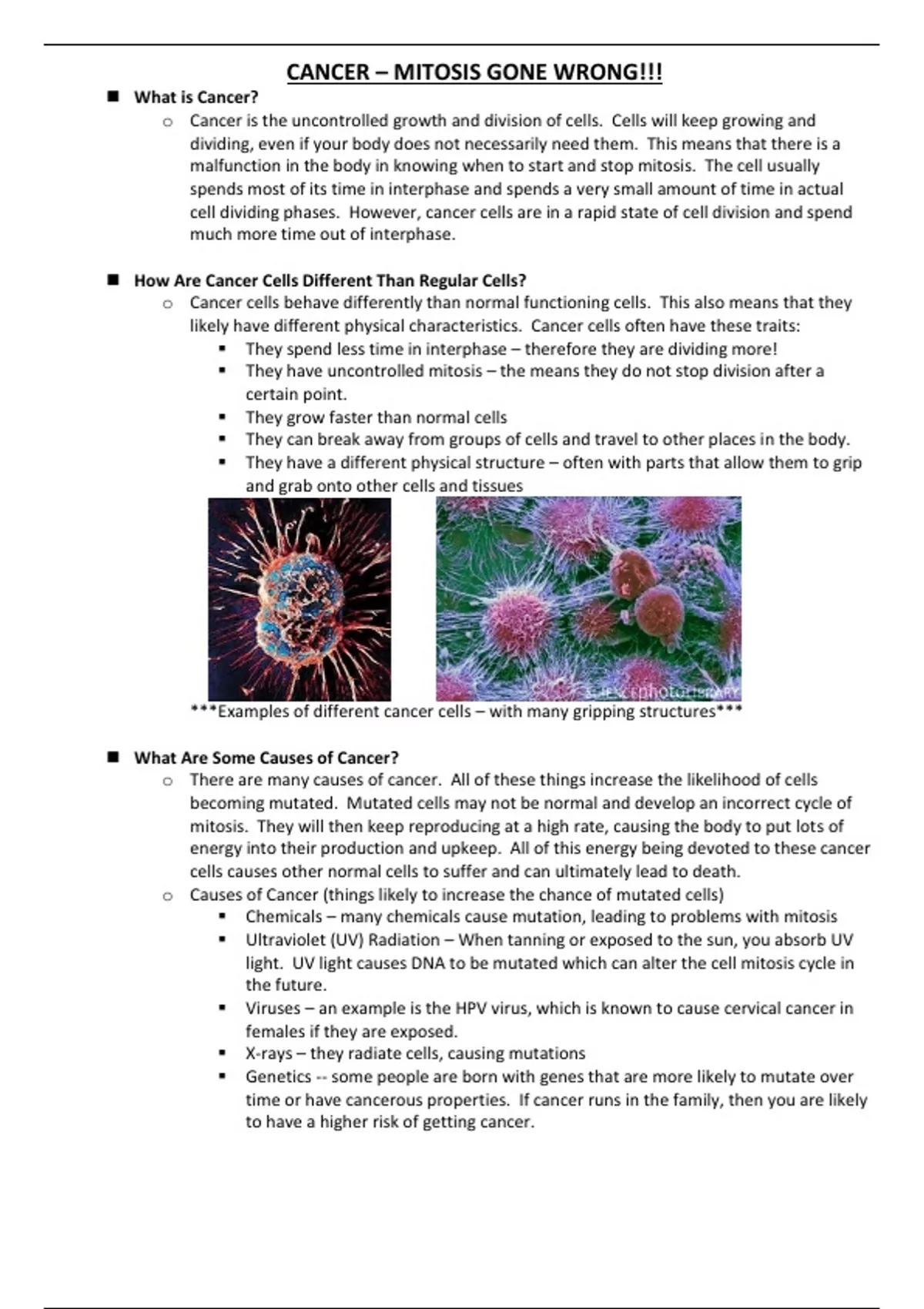 Cancer is the uncontrolled growth and division of cells. Cells will keep growing and dividing, even if your body does not necessarily need them. This means that there is a malfunction in the body in knowing when to start and stop mitosis. The cell usually spends most of its time in interphase and spends a very small amount of time in actual cell dividing phases. However, cancer cells are in a rapid state of cell division and spend much more time out of interphase.