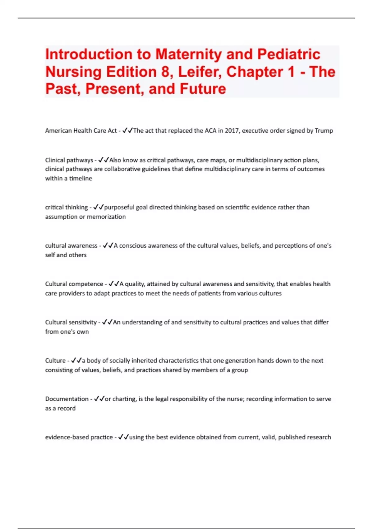 American Health Care Act - The act that replaced the ACA in 2017, executive order signed by Trump Clinical pathways - Also know as critical pathways, care maps, or multidisciplinary action plans, clinical pathways are collaborative guidelines that define multidisciplinary care in terms of outcomes within a timeline critical thinking - purposeful goal directed thinking based on scientific evidence rather than assumption or memorization cultural awareness - A conscious awareness of the cultural values, beliefs, and perceptions of one's self and others Cultural competence - A quality, attained by cultural awareness and sensitivity, that enables health care providers to adapt practices to meet the needs of patients from various cultures Cultural sensitivity - An understanding of and sensitivity to cultural practices and values that differ from one's own Culture - a body of socially inherited characteristics that one generation hands down to the next consisting of values, beliefs, and practices shared by members of a group Documentation - or charting, is the legal responsibility of the nurse; recording information to serve as a record evidence-based practice - using the best evidence obtained from current, valid, published researchFamily Care Plan - an expansion of the nursing care plan that includes family members. global nursing - nursing care that stress the importance of communication, partnerships, and an understanding of how health care beliefs of different cultures affect healthcare practices and delivery of care across the globe in order to improve the health of those living within the community in which they serve