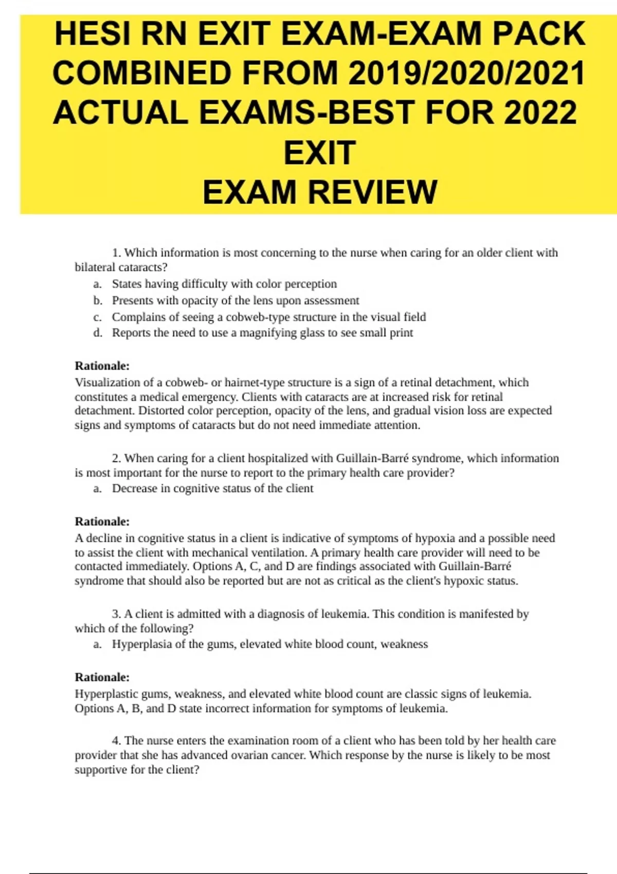 HESI RN EXIT EXAM-EXAM PACK COMBINED FROM 2019/2020/2021 ACTUAL EXAMS-BEST FOR 2022 EXIT EXAM REVIEW