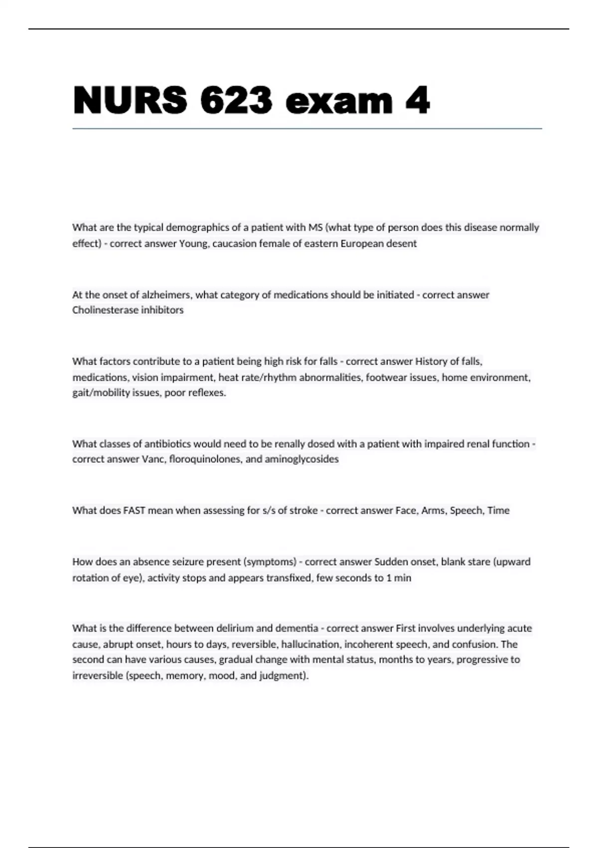 NURS 623 exam 4 What are the typical demographics of a patient with MS (what type of person does this disease normally effect) - correct answer Young, caucasion female of eastern European desent At the onset of alzheimers, what category of medications should be initiated - correct answer Cholinesterase inhibitors What factors contribute to a patient being high risk for falls - correct answer History of falls, medications, vision impairment, heat rate/rhythm abnormalities, footwear issues, home environment, gait/mobility issues, poor reflexes. What classes of antibiotics would need to be renally dosed with a patient with impaired renal function - correct answer Vanc, floroquinolones, and aminoglycosides What does FAST mean when assessing for s/s of stroke - correct answer Face, Arms, Speech, Time How does an absence seizure present (symptoms) - correct answer Sudden onset, blank stare (upward rotation of eye), activity stops and appears transfixed, few seconds to 1 min What is the difference between delirium and dementia - correct answer First involves underlying acute cause, abrupt onset, hours to days, reversible, hallucination, incoherent speech, and confusion. The second can have various causes, gradual change with mental status, months to years, progressive to irreversible (speech, memory, mood, and judgment). What are the risk factors for development of a pressure ulcer? - correct answer Elderly are most at risk population. Thin skin and less subcutaneous fat along with less movement create and environment for pressure ulcers. What are the red flag signs of a patient with low back pain. - correct answer Hx trauma, fever, unexplained weight loss, hx cancer, incontinence, long term steroid use, parental drug abuse, intense localized pain, inability to find comfortable position, Cadua Equina Syndrome. Always assess radiation of pain, bowel, bladder. What are the common bacterial organisms associated with bacterial meningitis. - correct answer Neisseria meningitides (high mortality), haemophilus influenza type B, streptococcus pneumoniae most common What are the s/s of alzheimers? - correct answer Presence of dementia by clinical exam and MMSE (mini-mental state exam) deficit in 2 or more areas of cognition, progressive worsening of memory and cognitive function without disturbed consciousness and absence of systemic illness/other brain disease. Impaired ability to learn new info along with disturbance in language, function, or perception. What are the s/s of Parkinsons? - correct answer Age >60, tremor at rest (pill rolling), rigidity, bradykinesia, masked face, stopped posture, shuffling gait, arching (limbs, neck, back), decrease facial dexterity, dysphagia, orthostatic hypotension, anosmia, depression, cognitive impairment, freezing phenomenon, cogwheeling, postural instability (advanced disease) What are the s/s of GB? - correct answer Prickling, pins and needles sensations in your fingers, toes, ankles or wrists. Weakness in your legs that spreads to your upper body. Unsteady walking or inability to walk or climb stairs. Difficulty with eye or facial movements, including speaking, chewing or swallowing. Severe pain that may feel achy or cramplike and may be worse at night. Difficulty with bladder control or bowel function. Rapid heart rate. Low or high blood pressure. Difficulty breathing. What are s/s of temporal arteritis? - correct answer Jaw claudication (pain with chewing that is relieved when stops chewing), unilateral pain, temporal area with scalp tenderness; skin over artery is indurated, tender, warm, and reddened. Amaurosis fugaz (temporary blindness), may occur. Low-grade fever and fatigue, occurs sometimes. ESR/sed rate (often reaches 100 mm/hr or more). CRP elevated >50. Medical Urgency: polymyalgia rheumatica common in these patients, older adults and elder are more common. What are articular bone structures? - correct answer Includes structures like the synovium, synovial fluid, articular cartilage, joint capsules, and juxta-articular bone. Articular disorders may be characterized by deep or diffuse pain, pain or limited ROM on active and passive movement, swelling, crepitus. What are non-articular bone structures? - correct answer Supportive structures such as tendons, bursae, muscles, fascia, bone, nerve, overlying skin. Tend to be painful on active but not passive (assisted) ROM. Seldom demonstrate swelling, crepitus, instability, or deformity by itself. What dx test is most useful in patient who presents with lumbar radiculopathy? - correct answer The straight leg raise (assesses L5-S1). This is best initial diagnostic because the most common disc herniation is at L5-S1. Straight leg raise will cause sciatica and radicular pain. In older adults, how can you increase physical activity-things you can encourage or are there certain underlying factors that would enable a patient to be more successful? - correct answer Ensure the patient is motivated What are s/s of bells palsy? (cranial nerve VII) - correct answer Facial paralysis with normal ocular movement and sensation. Loss of taste (dysgeusia). Postauricular pain. Sound sensitivity (hyperacusis). Heavy feeling in face. What are the demographics/people effected by bells palsy? - correct answer Anyone at any age. It occurs most often in pregnant women, and people who have diabetes, influenza, a cold, or another upper respiratory ailment. Bell's palsy affects men and women equally. It is less common before age 15 or after age 60. What is the testing for bells palsy? - correct answer There's no specific test for it. Your doctor will look at your face and ask you to move your facial muscles by closing your eyes, lifting your brow showing your teeth and frowning, among other movements. What is the treatment for Bells palsy? - correct answer Prevent eye injury, acyclovir, Prednisone, NSAIDs for pain, rest decreased auditory stimulation. Self limiting, recovery in a few weeks or months. What are the s/s of Migraine? -