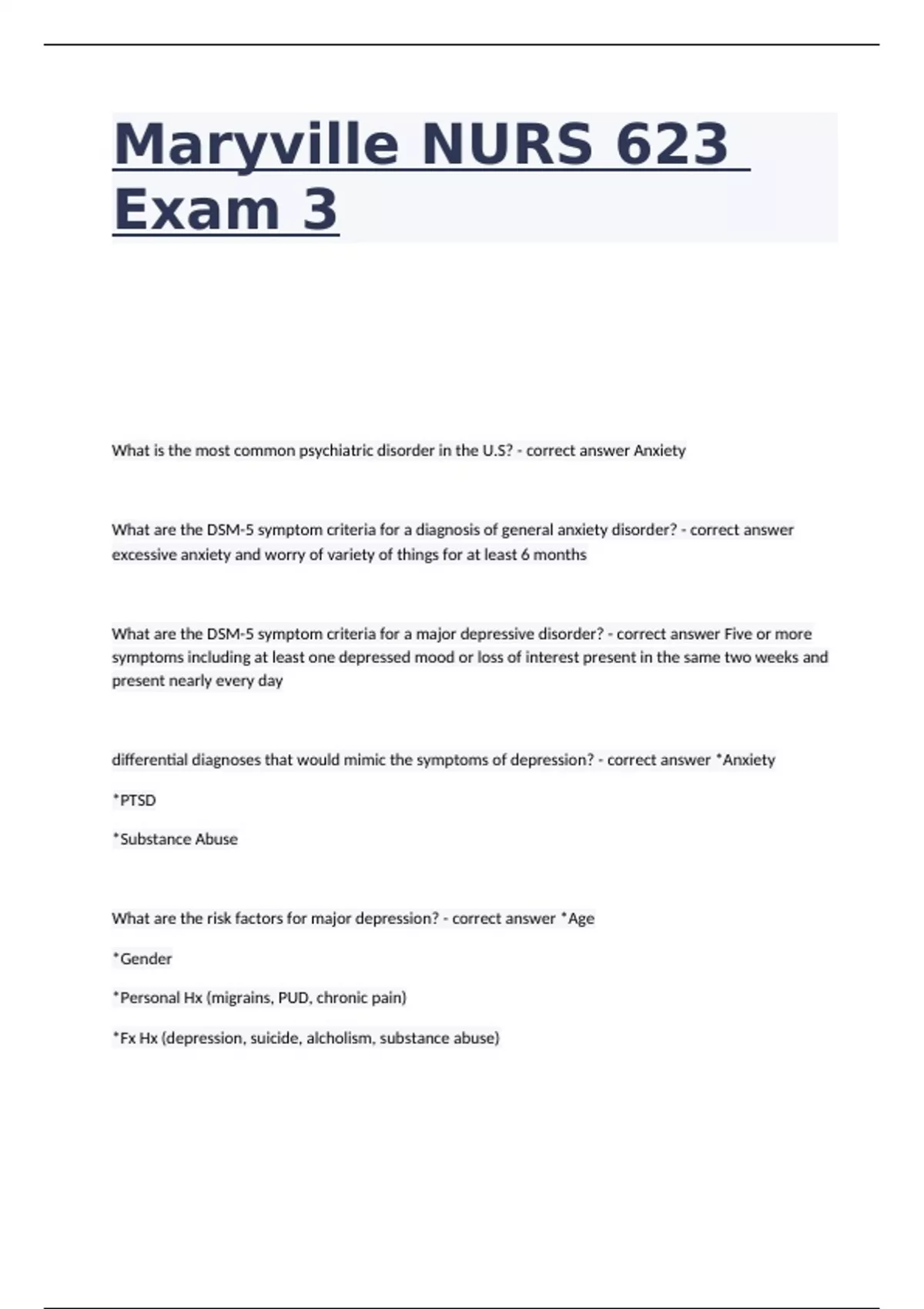 Maryville NURS 623 Exam 3 What is the most common psychiatric disorder in the U.S? - correct answer Anxiety What are the DSM-5 symptom criteria for a diagnosis of general anxiety disorder? - correct answer excessive anxiety and worry of variety of things for at least 6 months What are the DSM-5 symptom criteria for a major depressive disorder? - correct answer Five or more symptoms including at least one depressed mood or loss of interest present in the same two weeks and present nearly every day differential diagnoses that would mimic the symptoms of depression? - correct answer *Anxiety *PTSD *Substance Abuse What are the risk factors for major depression? - correct answer *Age *Gender *Personal Hx (migrains, PUD, chronic pain) *Fx Hx (depression, suicide, alcholism, substance abuse) What are the common presenting symptoms of depression in the geriatric patient? - correct answer Somatic (general pain) Psychology (feeling of guilt/worry, suicidal, memory) Psychomotor (anxiety/agitation) Vegetative (poor appitite/sleep) What are the NON-pharmacologic treatments for management for major depressive disorder? - correct answer Interpersonal and cognitive behavior therapy What are the pharmacologic treatments for management for major depressive disorder? - correct answer SSRI, SNRI, TCA, MAO Names of common SSRIs - correct answer Fluoxetine (Prozac) Sertraline (Zoloft) Paroxetine (paxil) Citalopram (celexa) Escitalopram (Lexapro) Names of common SNRIs - correct answer Duloxetine (Cymbalta) Venlafaxine (Effexor) Desvenlafaxine (Pristiq) What are concerns in elderly taking medication for major depression? - correct answer a slower metabolism requires lower dosing; greater risk of falls, osteoporosis, fractures What are the pharmacologic versus nonpharmacologic treatment for management for general anxiety disorder? - correct answer non-pharmacological interventions of cognitive behavioral therapy has proven equal results to SSRI pharmacologic therapy DIGFAST for bipolar because your digging yourself into hole - correct answer Distractibility Indiscretion/Insomnia Grandiosity Flight of ideas Activities ↑ Sleep Deficit Talkativeness What is the symptom criteria for BD I ? - correct answer identification of at least one-lifetime mania episode must have occurred What is the symptom criteria for BD II ? - correct answer identification of at least one hypomania episode and one major depressive episode must have occurred What is the symptom criteria for diagnosing unipolar (depression) - correct answer persistently depressed mood or loss of interest in activities, causing significant impairment in daily life (no mania/hypomania) How do you assess suicide risk (consider mnemonic SAD PERSONS) - correct answer S-ex A-ge D-epression P-revious attempt E-thanol abuse R-ational thinking loss S-ocial support loss O-rganized plan N-o spouse S-ickness How would you identify intimate partner violence? - correct answer *reluctant to speak in front of partner *gives evasive answers *Overly protective or controlling partner What are the stages of grieving? (DABDA) - correct answer Denial Anger Bargaining Depression Acceptance What are the phases of grief? (Aca) - correct answer Avoid Confront Accomadate Acknowledge the loss Reacting to the separation Recollecting and Re-experiencing the Relationship w/deceased How would you identify intimate partner violence? - correct answer 1) a patient who is reluctant to speak in front of her partner and gives evasive answers 2) Overly protective or controlling partner What is the clinical presentation of post-traumatic stress disorder (PTSD)? - correct answer A: INTRUSIVE thoughts, nightmares or flashbacks B: AVOIDANCE any situation of activity that brings memories C: HYPERAROUSAL: Hypersensitive or on edge, unprovoked anger, jumpiness, and on guard What are the DSM-5 criteria for a diagnosis of PTSD? - correct answer 1 SYMPTOM of intrusive, avoidance, or hyper-arousal MUST HAVE PERSISTED FOR MORE THAN 1 MONTH What is the management for PTSD? - correct answer PHARMACOLOGY: SSRI's paroxetine (paxil) or sertaline (Zoloft), anxiolytic buspirone (BuSpar) NON-PHARMACOLOGICAL: cognitive behavioral therapies, brief eclectic psychotherapy, narrative exposure therapy potential complications of over-prescription of opiate pain meds - correct answer Constipation Sedation Resp Depression Dizziness N/V Medications that can cause Constipation? - correct answer Antacids, anticholinergics, Anti convulsive, Antidepressants (TCAs), Antihypertensives, NSAIDs, Opioids What are the warning signs that the patient has Anorexia? - correct answer Substantial weight loss S/S of depression or mood swings cardio problems preoccupation with weight, calories, and food, wear baggy clothes history of excessive exercise What do labs look like in anorexia? - correct answer leukopenia elevated BUN anemic hypomagnesmia elevated TSH sinus bradycardia. What are the warning signs that the patient has Bulemia? - correct answer Significant weight gain tooth erosion calluses on back of hands esophageal erosion negative body image eats rapidly until uncomfortably full swollen salivary (parotid) glands irregular menses eat large amounts of food in isolation signs or symptoms of depression What do labs look like in bulemia? - correct answer Hyponatremia, hypochloremia, elevated amylase Discuss sleep hygiene strategies for a patient complaining of insomnia - correct answer Maintain a regular sleep and wake schedule Eat regular meals every day Develop a relaxing bedtime routine Limit amount of liquid consumed in evening Limit amount of caffeine consumed later in day Avoid tobacco and alcohol later in the day Avoid daytime naps Exercise regularly Limit exposure to bright lights or television in evening Bed should be used for sleeping and sex only Turn any clocks facing the bed away If not asleep after 20 mins get out of bed and engage in quiet activity before reattempting to fall asleep. What is the The most common long te