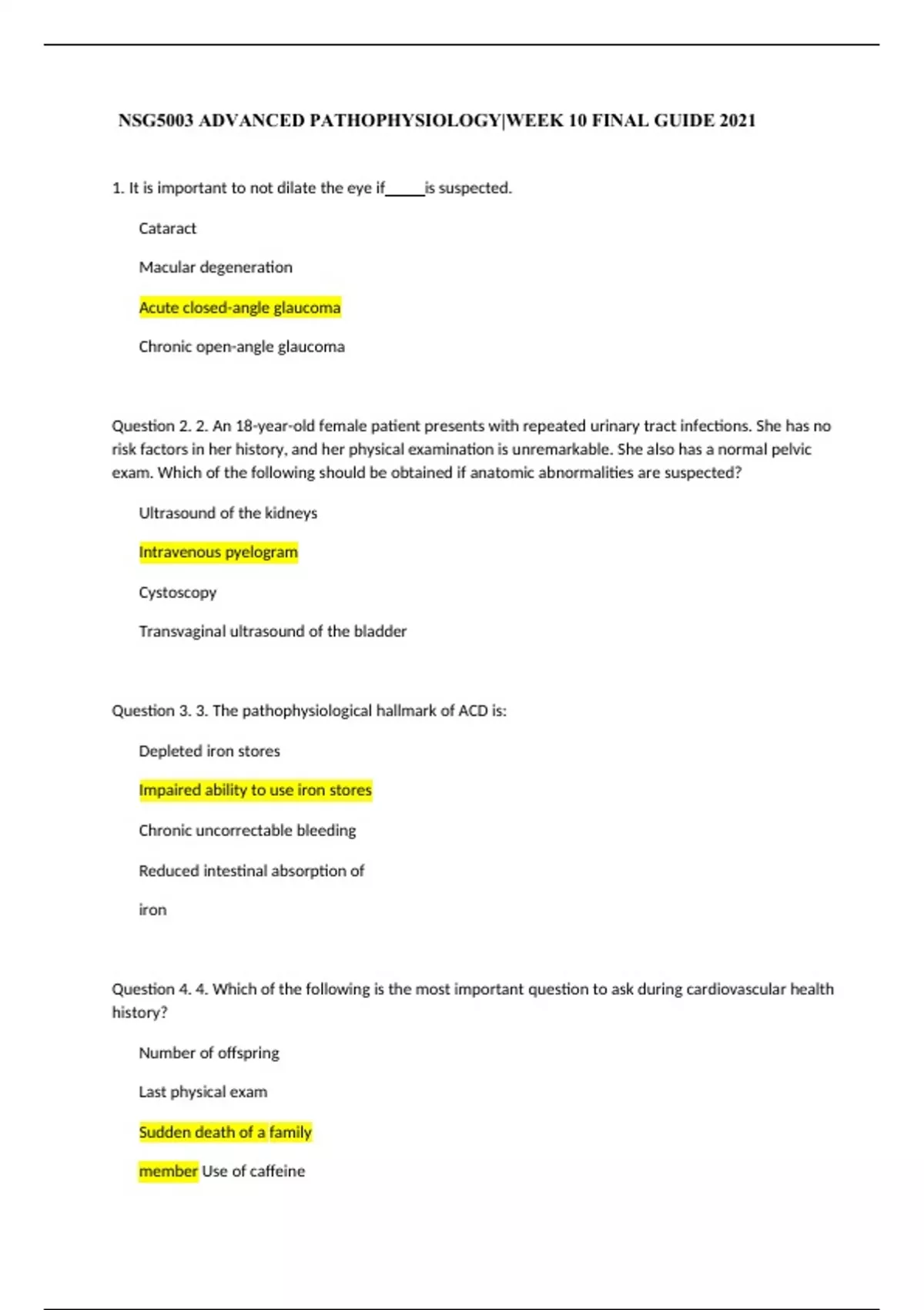 . It is important to not dilate the eye if is suspected. Cataract Macular degeneration Acute closed-angle glaucoma Chronic open-angle glaucoma Question 2. 2. An 18-year-old female patient presents with repeated urinary tract infections. She has no risk factors in her history, and her physical examination is unremarkable. She also has a normal pelvic exam. Which of the following should be obtained if anatomic abnormalities are suspected? Ultrasound of the kidneys Intravenous pyelogram Cystoscopy Transvaginal ultrasound of the bladder Question 3. 3. The pathophysiological hallmark of ACD is: Depleted iron stores Impaired ability to use iron stores Chronic uncorrectable bleeding Reduced intestinal absorption of iron Question 4. 4. Which of the following is the most important question to ask during cardiovascular health history? Number of offspring Last physical exam Sudden death of a family member Use of caffeine Question 5. 5. A 26-year-old, non-smoker, male presented to your clinic with SOB with exertion. This could be due to: Exercise-induced cough Bronchiectasis Alpha-1 deficiency Pericarditis Question 6. 6. Which of the following dermatological conditions results from reactivation of the dormant varicella virus? Tinea versicolor Seborrheic keratosis Verruca Herpes zoster Question 7. 7. Mr. Jones is a 68-year-old retired Air Force pilot that has been diagnosed with prostate cancer in the past week. He has never had a surgical procedure in his life and seeks clarification on the availability of treatments for prostate cancer. He asks the nurse practitioner to tell him the side effects of a radical prostatectomy. Which of the following is not a potential side effect of this procedure? Urinary incontinence Impotence Dribbling urine Selected low back pain Question 8. 8. Presbycusis is the hearing impairment that is associated with: Physiologic aging Ménière’s disease Cerumen impaction Herpes zoster Question 9. 9. Asymptomatic 1+ bacteriuria is found in a nursing home resident with an indwelling catheter. The nurse practitioner’s initial intervention includes: Assessing resident’s cognitive status and last change of the catheter/bag Prescribing prophylactic Bactrim 1 tablet at bedtime Ordering a urine culture and sensitivity and prescribing empiric treatment until results obtained Ordering an X-ray of the kidney, urine, and bladder Question 10. 10. A 64-year-old male presents with erythema of the sclera, tearing, and bilateral pruritus of the eyes. The symptoms occur intermittently throughout the year and he has associated clear nasal discharge. Which of the following is most likely because of the inflammation? Bacterium Allergen Virus Fungi Question 11. 11. The nurse practitioner is examining a 62-year-old female who has been complaining of lower abdominal pain. Upon auscultation, bowel sounds are high pitched and tinkling. Which of the following terms describes this finding? Succession splash Borborygmi Tenesmus Puddle sign Question 12. 12. Which ethnic group has the highest incidence of prostate cancer? Asians Hispanics African Americans American Indians Question 13. 13. A key symptom of ischemic heart disease is chest pain. However, angina equivalents may include exertional dyspnea. Angina equivalents are important because: Women with ischemic heart disease many times do not present with chest pain Some patients may have no symptoms or atypical symptoms; diagnosis may only be made at the time of an actual myocardial infarction Elderly patients have the most severe symptoms A & B only Question 14. 14. The nurse practitioner is discussing lifestyle changes with a patient diagnosed with gastroesophageal reflux. What are the nonpharmacological management interventions that should be included? Weight reduction and rest 30 minutes after each meal in the supine position Elevation of head of the bed 4-6 inches on blocks and weight reduction Encouraged to wear restrictive clothing to add support for diaphragmatic breathing Using oral mints to relieve gastric distress Question 15. 15. Which lesions are typically located along the distribution of dermatome? Scabies Herpes zoster Tinea Dyshidrosis Question 16. 16. Which of the following medications are commonly associated with the side effect of cough? Beta blocker Diuretic ACE inhibitor Calcium antagonist ...................................................................................................continue.