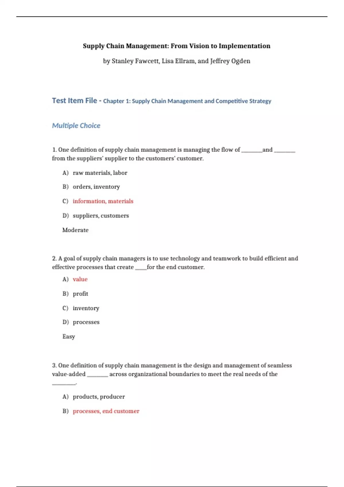 Test Item File - Chapter 1: Supply Chain Management and Competitive Strategy
