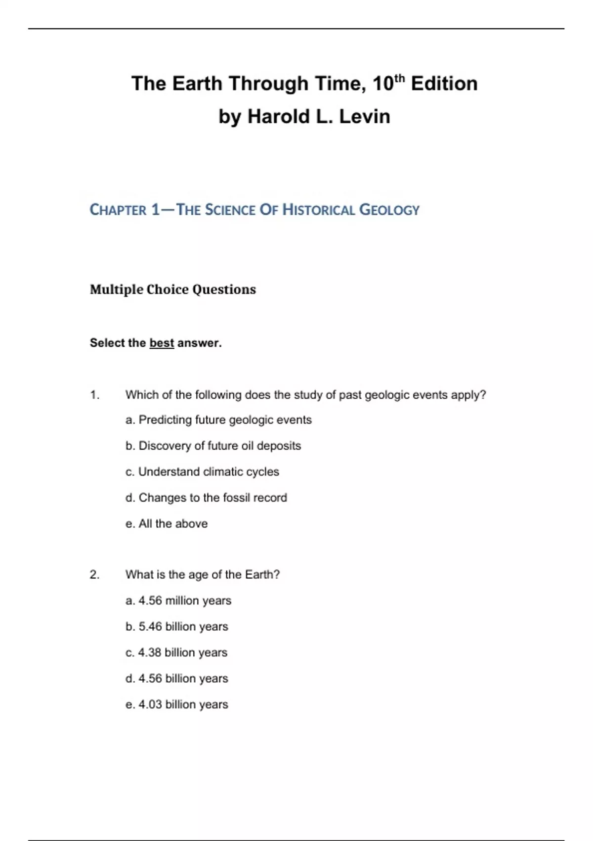 Make the Test Bank for [The Earth Through Time,Levin,10e] your companion for exam preparation. Utilize it to practice exam questions and get official exams and answers. Here's to achieving exam success in !