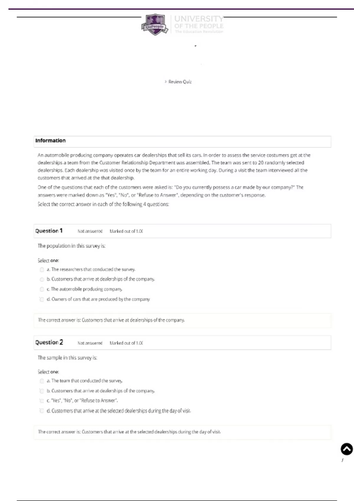 Dashboard / My courses / MATH 1280-01 - AY2023-T4 / 7 April - 13 April / Self-Quiz Unit 1 An automobile producing company operates car dealerships that sell its cars. In order to assess the service costumers get at the dealerships a team from the Customer Relationship Department was assembled. The team was sent to 20 randomly selected dealerships. Each dealership was visited once by the team for an entire working day. During a visit the team interviewed all the customers that arrived at that dealership. One of the questions that each of the customers were asked is: "Do you currently possess a car made by our company?" The answers were marked down as "Yes", "No", or "Refuse to Answer", depending on the customer's response. Select the correct answer in each of the following 4 questions: The Customers Service Center of a large bank receive calls from customers. The number of incoming calls between 8:00 AM and 8:10 AM in consecutive days were recorded. The number of incoming calls during the working days of the month of September were: 8, 10, 6, 7, 12, 7, 8, 7, 8, 6, 9, 4, 6, 14, 10, 10, 10, 10, 6, 10, 12, 7 The number of incoming calls during the working days of the month of February were: 9, 11, 14, 6, 4, 6, 7, 3, 3, 2, 5, 6, 6, 5, 6, 7, 5, 4, 3, 5. Create two R objects, one by the name "Sep", and the other by the name "Feb". The first object should contain the first data and the second object should contain the second data. Produce a frequency table (with the function "table") for each of the objects and a bar plot (with the combination of the function "plot" and the function "table"). For comparison, bar plots like the one you should obtain are presented in Figure 1.6. and Figure 1.7. In light of the description given above, and based on the tables and/or the plots, select the correct answer in each of the following 6 questions: Question 7 Correct The average number of calls recorded in the object "Feb" is 5.85. The average in the object "Sep" is 8.5. The ◄MaLrke1a.r0n0ionugt oJof urnal Udniftfe1rence between these 1.00 Select one: a. A population. b. A sample. c. A statistic. d. None of the above. The difference between the averages is a characteristic of the data, a statistic. A hint that the correct answer is a statistic and not a parameter is the fact that one can compute the value of the average from the data. ..........................................................continued.......................................