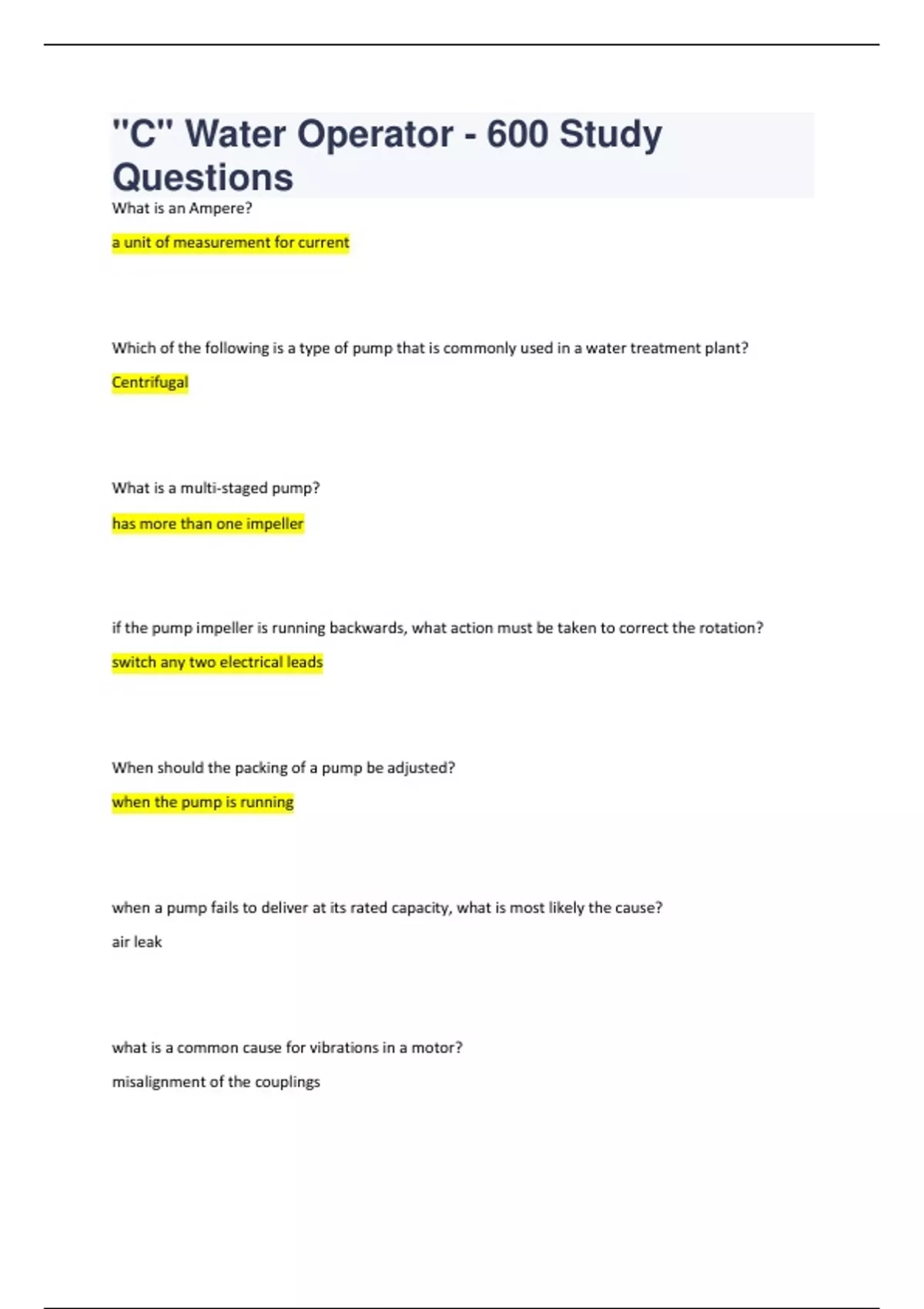 What is an Ampere? a unit of measurement for current Which of the following is a type of pump that is commonly used in a water treatment plant? Centrifugal What is a multi-staged pump? has more than one impeller if the pump impeller is running backwards, what action must be taken to correct the rotation? switch any two electrical leads