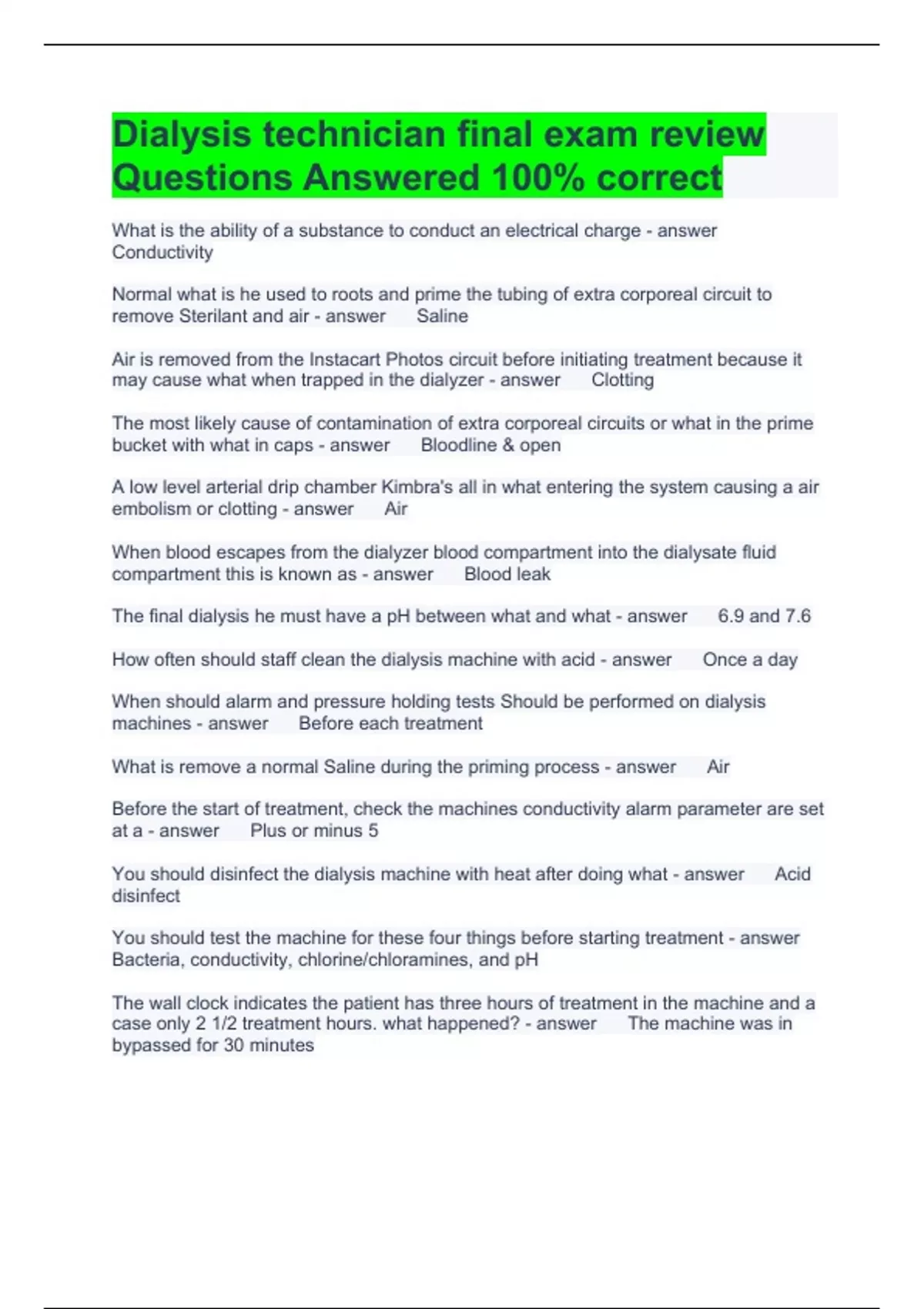 Dialysis technician final exam review Questions Answered 100% correct What is the ability of a substance to conduct an electrical charge Conductivity Normal what is he used to roots and prime the tubing of extra corporeal circuit to remove Sterilant and air Saline Air is removed from the Instacart Photos circuit before initiating treatment because it may cause what when trapped in the dialyzer Clotting The most likely cause of contamination of extra corporeal circuits or what in the prime bucket with what in caps Bloodline & open A low level arterial drip chamber Kimbra's all in what entering the system causing a air embolism or clotting Air When blood escapes from the dialyzer blood compartment into the dialysate fluid compartment this is known as Blood leak The final dialysis he must have a pH between what and what 6.9 and 7.6 How often should staff clean the dialysis machine with acid Once a day When should alarm and pressure holding tests Should be performed on dialysis machines Before each treatment What is remove a normal Saline during the priming process Air Before the start of treatment, check the machines conductivity alarm parameter are set at a Plus or minus 5 You should disinfect the dialysis machine with heat after doing what Acid disinfect You should test the machine for these four things before starting treatment Bacteria, conductivity, chlorine/chloramines, and pH The wall clock indicates the patient has three hours of treatment in the machine and a case only 2 1/2 treatment hours. what happened? The machine was in bypassed for 30 minutes Prior to applying the blood pressure cuff on a new patient, the patient care tech should blank both patient's arm for the presence of blank Examine and access Available weight gain is described as a pre-treatment minus Estimated dry weight A red and warm vascular access may be a sign of Infection Pre-treatment a violation of internal vascular assets include palpating for a Thrill What three items of PPE are required when performing venipuncture Gloves, for facial or mask and protective eyewear with Side shield and fluid resistant gown Damage to the initial lining of the vessel is likely to occur when the needle is blank after incision Flipped When cannulating a new AV Fistula always applies the blank and stay at least blank to blank inches from the incisions Tourniquet and 1 1/2 to 2 inches Pre-pump arterial pressure should not exceed -250 Make sure access is stable and remains what Uncovered The patient's Venus needle has infiltrated and another needle and needs to be inserted you should insert the new needle _______ The infiltrate and apply what to the area Above and ice We're removing needles from Anna internal access, the needle should be ______ Removing the needle from the patient's access Engaged While removing the needle from the patients access Access _________ Can jeopardize the adequacy of a dialysis treatment Recirculation You should apply the access needle safety device as the needle is being Disengaged Report a blood pressure over 180/100 to the nurse Report It cost less than what or greater than what beats per minute to the nurse 60 and 100 Before calculating a patient access, you should clean the site for at least how long 30 seconds After cannulate in an access you should place the tape directly over the Wings How long should you wait to initiate treatment after administering heparin bolus 3 to 5 minutes Normal Celine is used to remove what and what from the extracorporeal circuit Sterilant and air Improperly prime dialyzers bloodline can increase the risk of what and what in the dialyzer Air embolism and clotting A low arterial alarm sound. The staff member should look for a possible cost in the circuit from the Arterial needles through to the blood pump When a high wenis alarm sounds, you should look from the top of the _____ through time the end of the _______ to determine the cause Venous chamber & Venous needle The adequacy of a dialysis treatment may be compromised by inadequate Heparization The patient presents to the dialysis center in with a pulse rate of 44 bpm but does not appear to be in any distress. What should be the dialysis technician immediate action Notified the nurse Don't dialysis, the patient blank and blank must be uncovered Access and face The adequacy of a dialysis treatment may be compromised by inadequate Heparization How many ml of saline Must be in the saline bag at the start of treatment 300ml The arterial chamber must be how full at the start of treatment 85 to 95% full The venous chamber must how full at the start of treatment 65 to 75% full What position should the transducer Clamps be in before starting the treatment Open Working result from low level arterial pressure drip chamber Air It's the needle infiltrates, the first thing you should do is turn off the Blood pump During dialysis, a large clot is noticed In the venous chamber. The clinical should replace the Venous line The venous pressure on the dialysis machine begin to rise but the venous needle is not infiltrated . the most likely cause is a clotted Venous line The condition most likely to rise the venous pressure is Venous needle occlusion When it is suspected that a patient has a air embolism, the first intervention, should be to ________the patients ___________ Clamp, bloodline A major complications that can occur when the patient is dialyzed to hypotonic dialysate is Hemolysis Hypokalemia ( High potassium) can result in ________ and ______ Muscle weakness and death