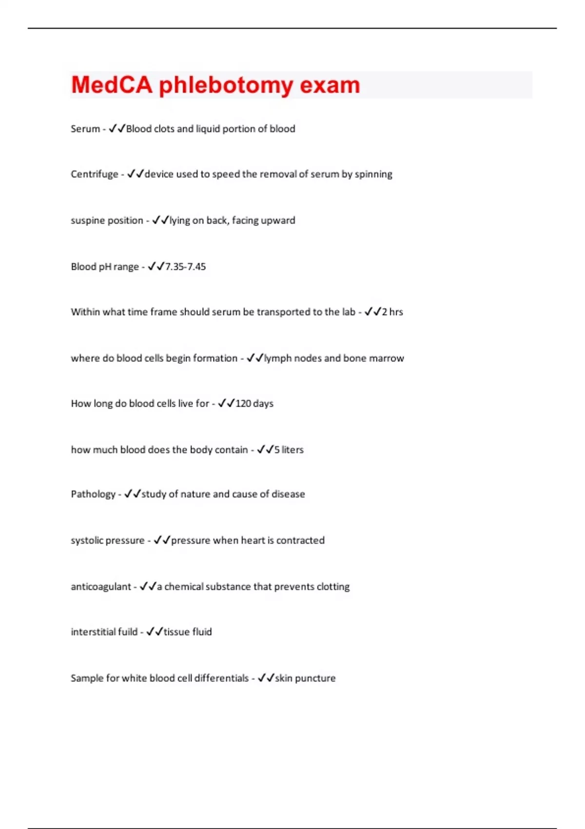erum - Blood clots and liquid portion of blood Centrifuge - device used to speed the removal of serum by spinning suspine position - lying on back, facing upward Blood pH range - 7.35-7.45 Within what time frame should serum be transported to the lab - 2 hrs where do blood cells begin formation - lymph nodes and bone marrow How long do blood cells live for - 120 days how much blood does the body contain - 5 liters Pathology - study of nature and cause of disease systolic pressure - pressure when heart is contracted anticoagulant - a chemical substance that prevents clotting interstitial fuild - tissue fluid Sample for white blood cell differentials - skin puncture
