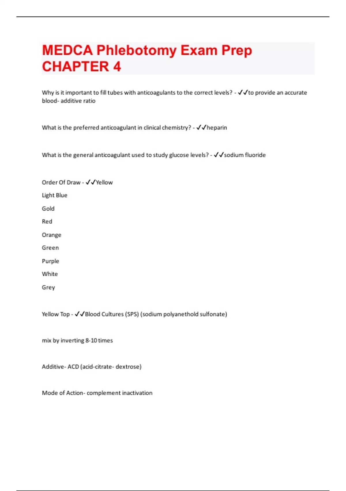 Why is it important to fill tubes with anticoagulants to the correct levels? - to provide an accurate blood- additive ratio What is the preferred anticoagulant in clinical chemistry? - heparin What is the general anticoagulant used to study glucose levels? - sodium fluoride Order Of Draw - Yellow Light Blue Gold Red Orange Green Purple White Grey Yellow Top - Blood Cultures (SPS) (sodium polyanethold sulfonate) mix by inverting 8-10 times Additive- ACD (acid-citrate- dextrose) Mode of Action- complement inactivationUses- paternity testing, DNA studies, HLA tissue testing Light Blue Top - Citrate Mix by inverting 3-4 times Additive- Sodium Citrate Mode of Action- forms calcium salts to remove calcium Uses- coagulation tests, full draw required Dark Blue Top - Additive- Sodium EDTA