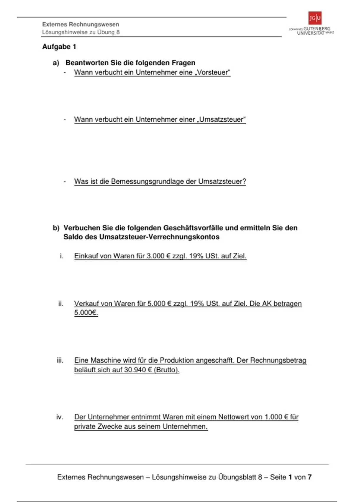 Externes Rechnungswesen – Lösungshinweise zu Übungsblatt 8 – Seite 1 von 7