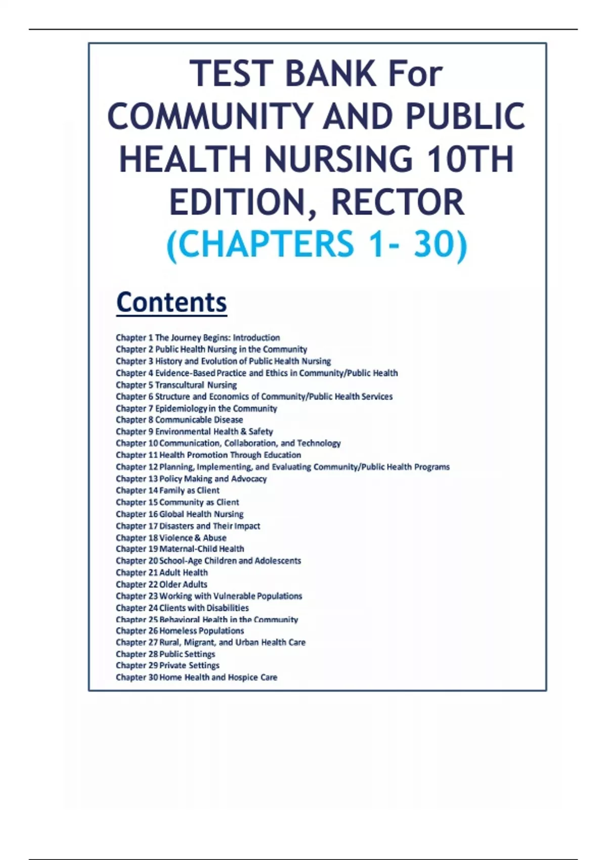 TEST BANK For COMMUNITY AND PUBLIC HEALTH NURSING 10TH EDITION, RECTOR | COMPLETE GUIDE A+, CHAPTERS 1-30
