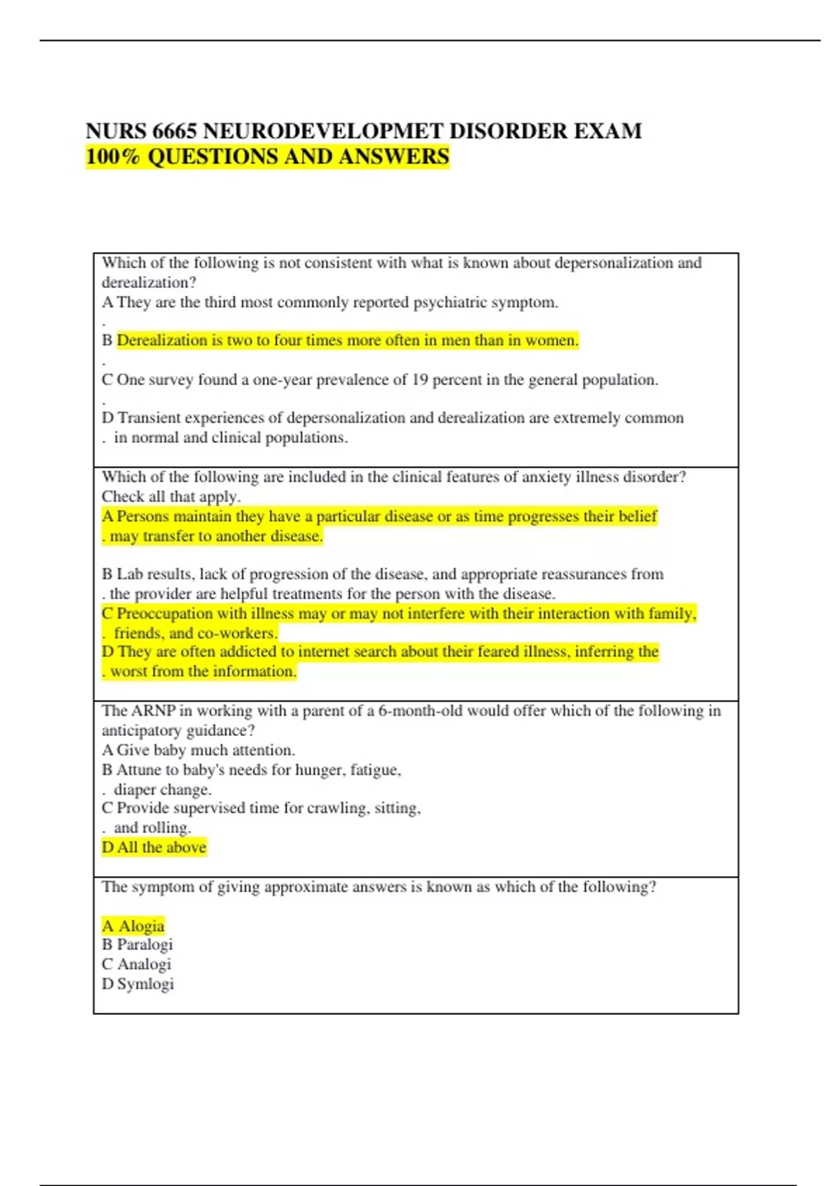 NURS 6665 NEURODEVELOPMET DISORDER EXAM 100% QUESTIONS AND ANSWERS