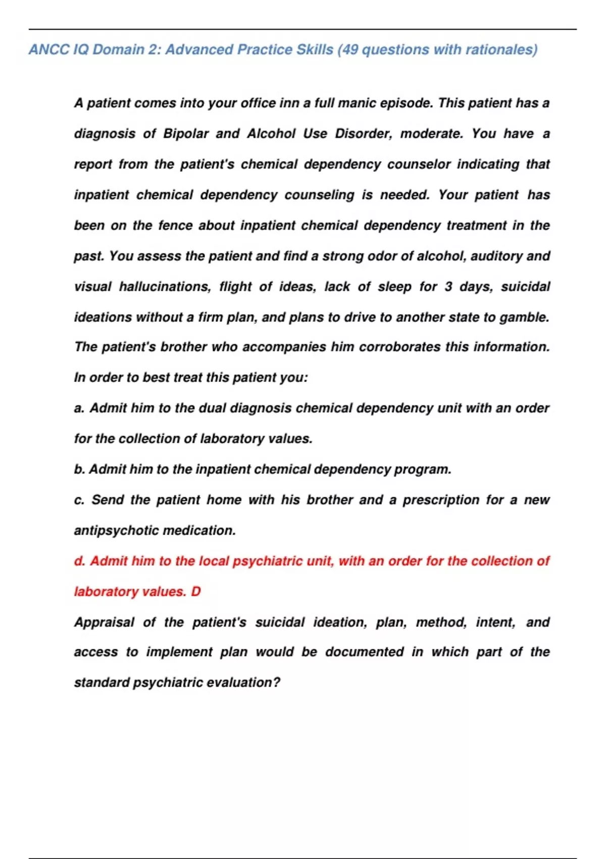 ANCC IQ Domain 2 Advanced Practice Skills (49 questions with rationales)