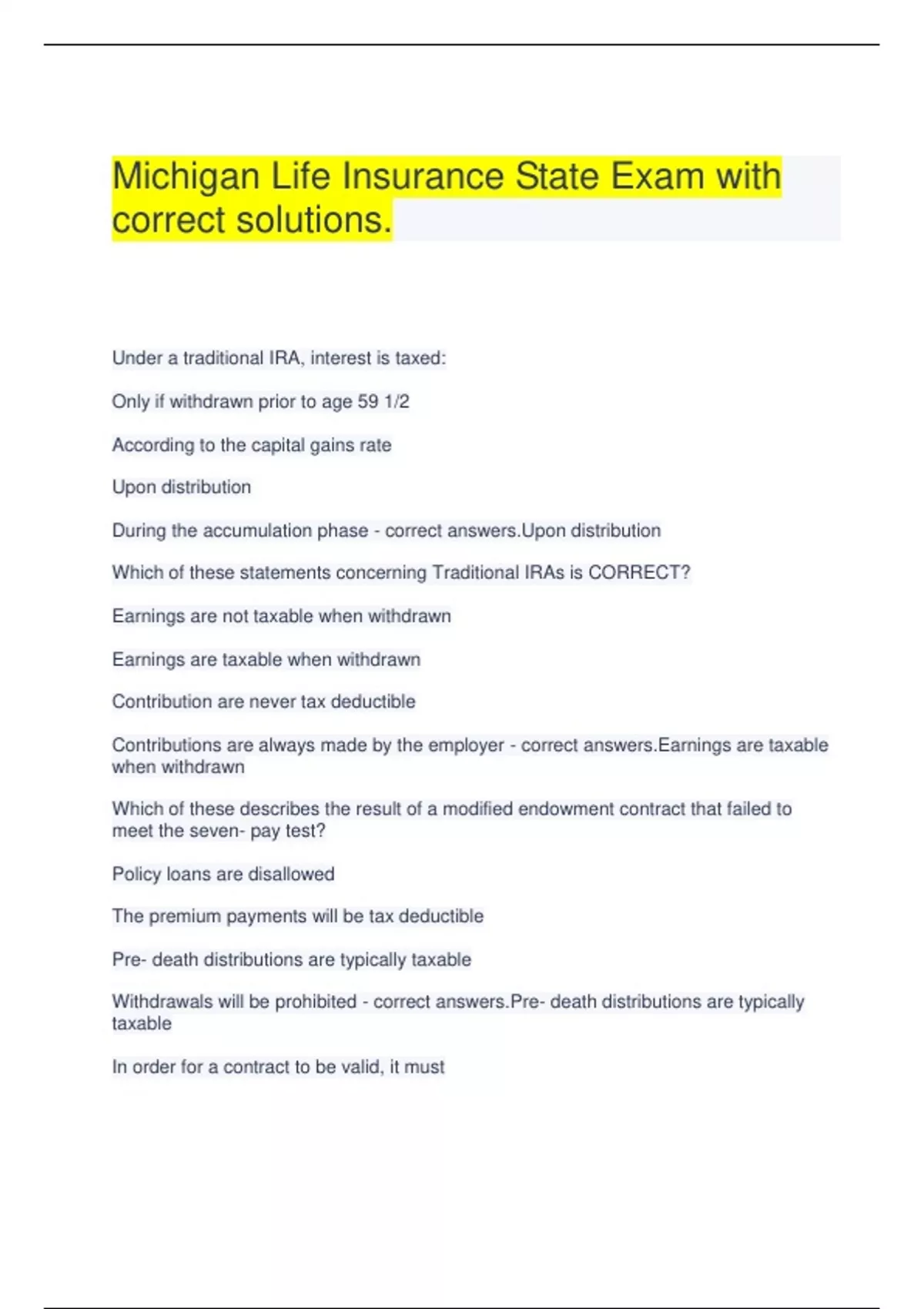 Michigan Life Insurance State Exam with correct solutions. Under a traditional IRA, interest is taxed: Only if withdrawn prior to age 59 1/2 According to the capital gains rate Upon distribution During the accumulation phase - correct answers.Upon distribution Which of these statements concerning Traditional IRAs is CORRECT? Earnings are not taxable when withdrawn Earnings are taxable when withdrawn Contribution are never tax deductible Contributions are always made by the employer - correct answers.Earnings are taxable when withdrawn Which of these describes the result of a modified endowment contract that failed to meet the seven- pay test? Policy loans are disallowed The premium payments will be tax deductible Pre- death distributions are typically taxable Withdrawals will be prohibited - correct answers.Pre- death distributions are typically taxable In order for a contract to be valid, it must be filled with the state be signing and witnessed by an attorney be in writing contain offer and acceptance - correct answers.Contain offer and acceptance Which of the following actions is REQUIRED by a producer who is replacing an existing life insurance policy? Keep replacement records on file for at least 10 years Notify the existing insurer of the proposed replacement Submit to the replacing insurer a list of the policies to be replaced Offer the insured a 60- day free- look period - correct answers.Submit to the replacing insurer a list of the policies to be replaced Who were Keogh plans designed to provide pension benefits for? Corporate officers Public school employees The self-employed Government employees - correct answers.The self emplyed A producer's fiduciary duty requires that premiums are maintained in a personal bank account until remittance to insurer premiums be deposited in an interest bearing account premiums are forwarded to the insurer on a timely basis premiums be commingled - correct answers.Premiums are forwarded on a timely basis An individual who removes the risk of losing money in the stock market by never purchasing stocks is said to be engaging in Risk reduction Risk Transference