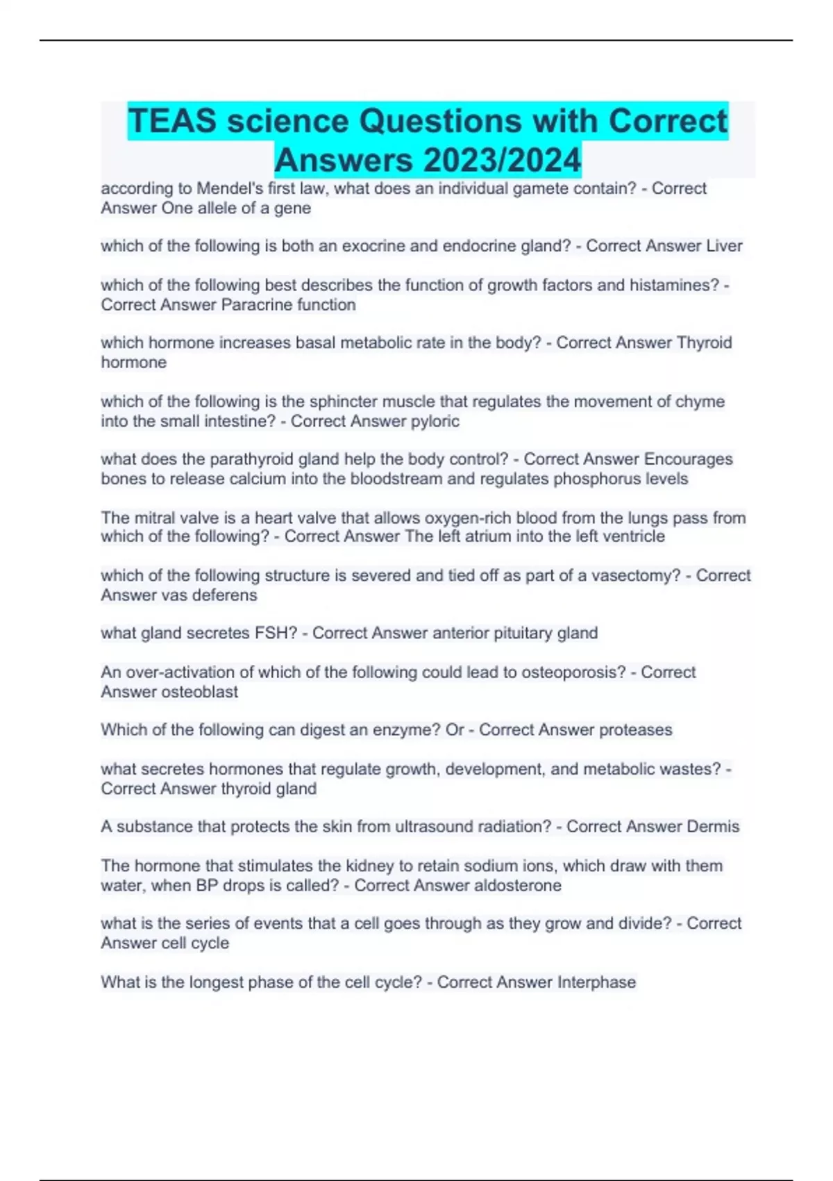 according to Mendel's first law, what does an individual gamete contain? - Correct Answer One allele of a gene which of the following is both an exocrine and endocrine gland? - Correct Answer Liver which of the following best describes the function of growth factors and histamines? - Correct Answer Paracrine function which hormone increases basal metabolic rate in the body? - Correct Answer Thyroid hormone which of the following is the sphincter muscle that regulates the movement of chyme into the small intestine? - Correct Answer pyloric what does the parathyroid gland help the body control? - Correct Answer Encourages bones to release calcium into the bloodstream and regulates phosphorus levels The mitral valve is a heart valve that allows oxygen-rich blood from the lungs pass from which of the following? - Correct Answer The left atrium into the left ventricle which of the following structure is severed and tied off as part of a vasectomy? - Correct Answer vas deferens what gland secretes FSH? - Correct Answer anterior pituitary gland An over-activation of which of the following could lead to osteoporosis? - Correct Answer osteoblast Which of the following can digest an enzyme? Or - Correct Answer proteases what secretes hormones that regulate growth, development, and metabolic wastes? - Correct Answer thyroid gland A substance that protects the skin from ultrasound radiation? - Correct Answer Dermis The hormone that stimulates the kidney to retain sodium ions, which draw with them water, when BP drops is called? - Correct Answer aldosterone what is the series of events that a cell goes through as they grow and divide? - Correct Answer cell cycle What is the longest phase of the cell cycle? - Correct Answer Interphase