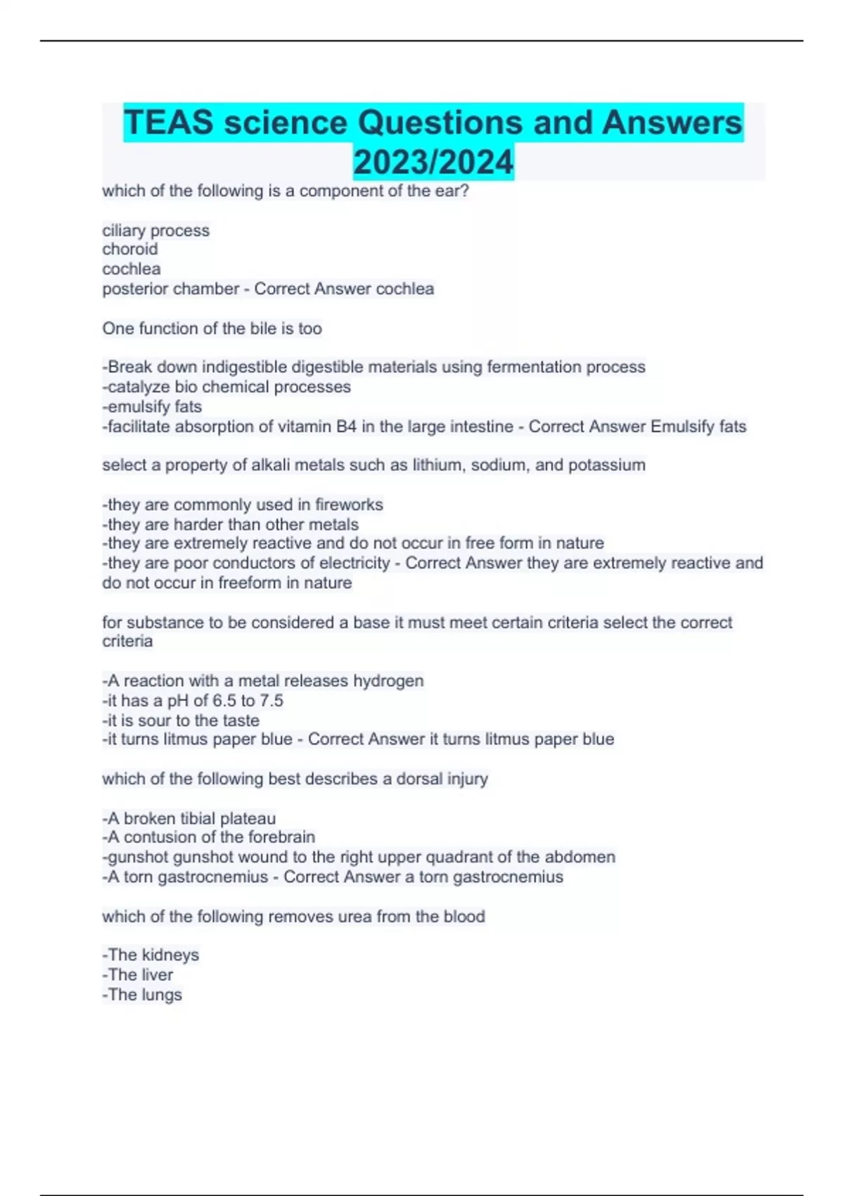 which of the following is a component of the ear? ciliary process choroid cochlea posterior chamber - Correct Answer cochlea One function of the bile is too -Break down indigestible digestible materials using fermentation process -catalyze bio chemical processes -emulsify fats -facilitate absorption of vitamin B4 in the large intestine - Correct Answer Emulsify fats select a property of alkali metals such as lithium, sodium, and potassium -they are commonly used in fireworks -they are harder than other metals -they are extremely reactive and do not occur in free form in nature -they are poor conductors of electricity - Correct Answer they are extremely reactive and do not occur in freeform in nature for substance to be considered a base it must meet certain criteria select the correct criteria -A reaction with a metal releases hydrogen -it has a pH of 6.5 to 7.5 -it is sour to the taste -it turns litmus paper blue - Correct Answer it turns litmus paper blue which of the following best describes a dorsal injury -A broken tibial plateau -A contusion of the forebrain -gunshot gunshot wound to the right upper quadrant of the abdomen -A torn gastrocnemius - Correct Answer a torn gastrocnemius which of the following removes urea from the blood -The kidneys -The liver -The lungs