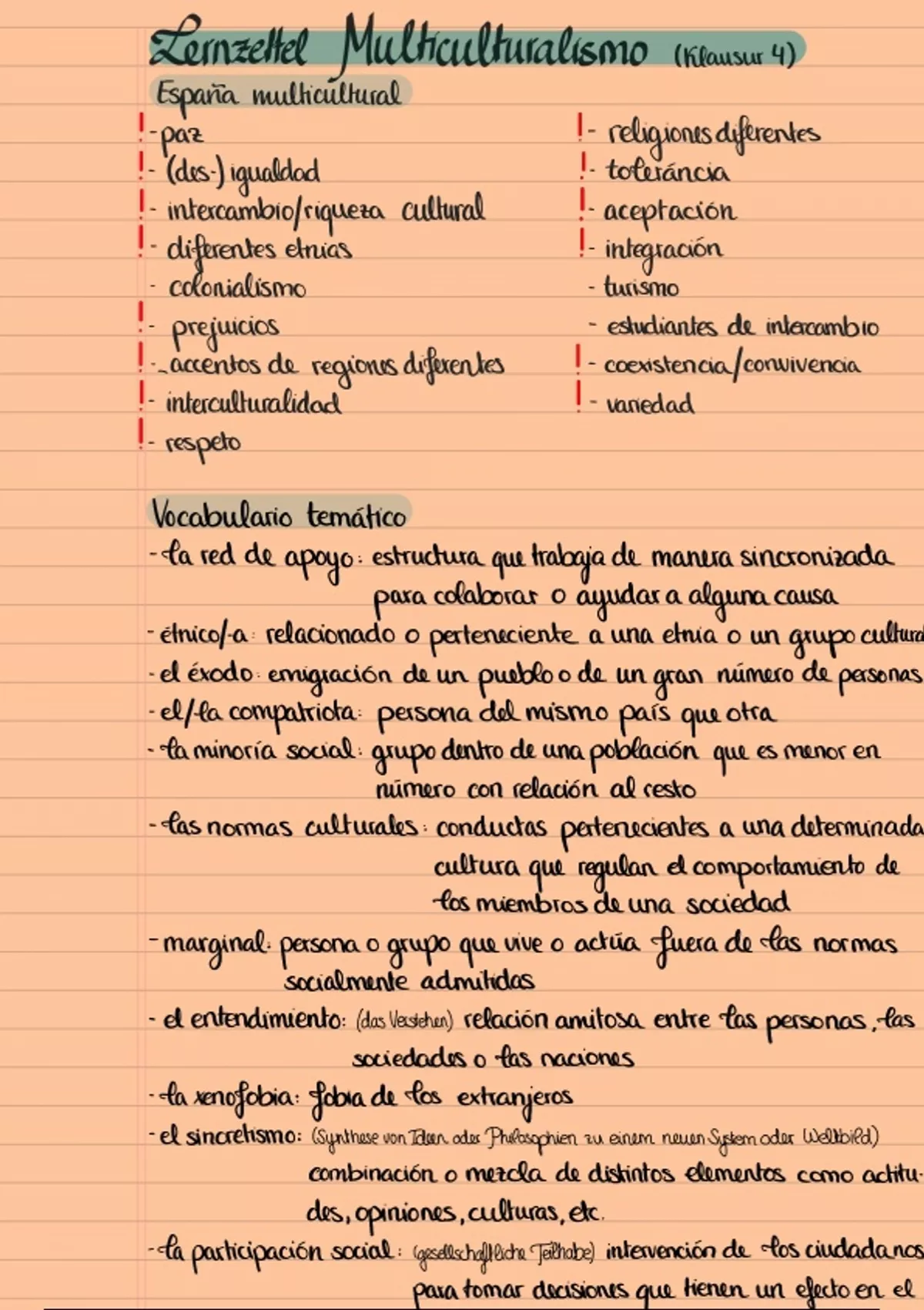 In diesem Dokument findest Du meine Zusammenfassung des Quartals zum Thema Multiculturalismo en España im Fach Spanisch der gymnasialen Oberstufe. Der Lernzettel enthält inhaltliche Erklärungen, hilfreiche Vokabeln, Pro und Kontra Argumente und Anleitungen zum Verfassen verschiedener Textarten (Analyse, formaler Brief, Zusammenfassung)!