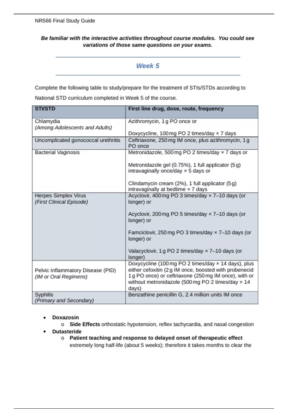 Complete the following table to study/prepare for the treatment of STIs/STDs according to National STD curriculum completed in Week 5 of the course. STI/STD First line drug, dose, route, frequency Chlamydia (Among Adolescents and Adults) Azithromycin, 1 g PO once or Doxycycline, 100 mg PO 2 times/day × 7 days Uncomplicated gonococcal urethritis Ceftriaxone, 250 mg IM once, plus azithromycin, 1 g PO once Bacterial Vaginosis Metronidazole, 500 mg PO 2 times/day × 7 days or Metronidazole gel (0.75%), 1 full applicator (5 g) intravaginally once/day × 5 days or Clindamycin cream (2%), 1 full applicator (5 g) intravaginally at bedtime × 7 days Herpes Simplex Virus (First Clinical Episode) Acyclovir, 400 mg PO 3 times/day × 7–10 days (or longer) or Acyclovir, 200 mg PO 5 times/day × 7–10 days (or longer) or Famciclovir, 250 mg PO 3 times/day × 7–10 days (or longer) or Valacyclovir, 1 g PO 2 times/day × 7–10 days (or longer) Pelvic Inflammatory Disease (PID) (IM or Oral Regimens) Doxycycline (100 mg PO 2 times/day × 14 days), plus either cefoxitin (2 g IM once, boosted with probenecid 1 g PO once) or ceftriaxone (250 mg IM once), with or without metronidazole (500 mg PO 2 times/day × 14 days) Syphilis (Primary and Secondary) Benzathine penicillin G, 2.4 million units IM once Doxazosin o Side Effects orthostatic hypotension, reflex tachycardia, and nasal congestion Dutasteride o Patient teaching and response to delayed onset of therapeutic effect extremely long half-life (about 5 weeks); therefore it takes months to clear the