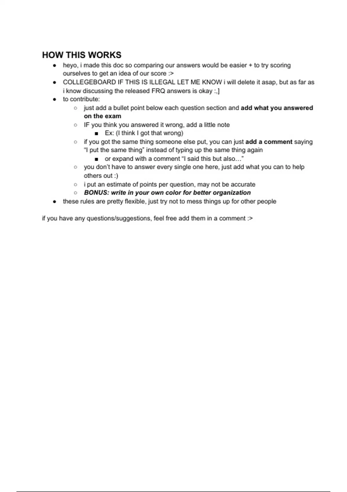 This is a document containing questions and answers from the AP Biology exam that is structured to help students review and practice their understanding of the subject. It consists of a series of free-response questions (FRQs) representative of the types of questions found on the actual AP Biology exam. The questions cover a wide range of topics within biology, including cellular processes, genetics, evolution, ecology, physiology, and more. Overall, this document would be a valuable study resource for students preparing for the AP Biology exam. It would offer a diverse range of questions and comprehensive answers, helping students test their knowledge, practice their skills, and improve their performance on the exam.