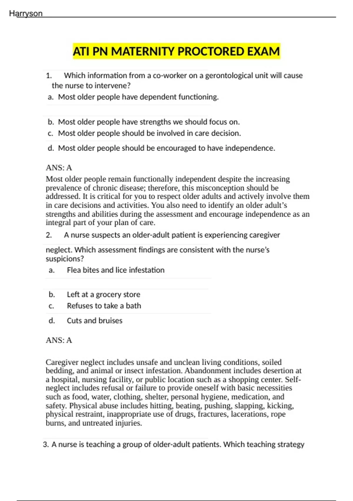 ATI PN MATERNITY PROCTORED EXAM.docxATI PN MATERNITY PROCTORED EXAM 1. Which information from a co-worker on a gerontological unit will cause the nurse to intervene? a. Most older people have dependent functioning. b. Most older people have strengths we should focus on. c. Most older people should be involved in care decision. d. Most older people should be encouraged to have independence. ANS: A Most older people remain functionally independent despite the increasing prevalence of chronic disease; therefore, this misconception should be addressed. It is critical for you to respect older adults and actively involve them in care decisions and activities. You also need to identify an older adult’s strengths and abilities during the assessment and encourage independence as an integral part of your plan of care. 2. A nurse suspects an older-adult patient is experiencing caregiver neglect. Which assessment findings are consistent with the nurse’s suspicions? a. Flea bites and lice infestation b. Left at a grocery store c. Refuses to take a bath d. Cuts and bruises ANS: A Caregiver neglect includes unsafe and unclean living conditions, soiled bedding, and animal or insect infestation. Abandonment includes desertion at a hospital, nursing facility, or public location such as a shopping center. Selfneglect includes refusal or failure to provide oneself with basic necessities such as food, water, clothing, shelter, personal hygiene, medication, and safety. Physical abuse includes hitting, beating, pushing, slapping, kicking, physical restraint, inappropriate use of drugs, fractures, lacerations, rope burns, and untreated injuries. 3. A nurse is teaching a group of older-adult patients. Which teaching strategy Harryson is best for the nurse to use? Provide several topics of discussion at once to promote independence a. and making choices. Avoid uncomfortable silences after questions by helping patients b. complete their statements. Ask patients to recall past experiences that correspond with their c. interests. d. Speak in a high pitch to help patients hear better. ANS: C Teaching strategies include the use of past experiences to connect new learning with previous knowledge, focusing on a single topic to help the patient concentrate, giving the patient enough time in which to respond because older adults’ reaction times are longer than those of younger persons, and keeping the tone of voice low; older adults are able to hear low sounds better than high-frequency sounds. 4. An older patient has fallen and suffered a hip fracture. As a consequence, the patient’s family is concerned about the patient’s ability to care for self, especially during this convalescence. What should the nurse do? a. Stress that older patients usually ask for help when needed. Inform the family that placement in a nursing center is a permanent b. solution. Tell the family to enroll the patient in a ceramics class to maintain c. quality of life. Provide information and answer questions as family members make d. choices among care options. ANS: D Nurses help older adults and their families by providing information and answering questions as they make choices among care options. Some older adults deny functional declines and refuse to ask for assistance with tasks that place their safety at great risk. The decision to enter a nursing center is never final, and a nursing center resident sometimes is discharged to home or to another less-acute residence. What defines quality of life varies and is unique for each person. 5. What is the best suggestion a nurse could make to a family requesting help in selecting a local nursing center? Have the family members evaluate nursing home staff according to a. their ability to get tasks done efficiently and safely. Make sure that nursing home staff members get patients out of bed b. and dressed according to staff’s preferences. Explain that it is impo