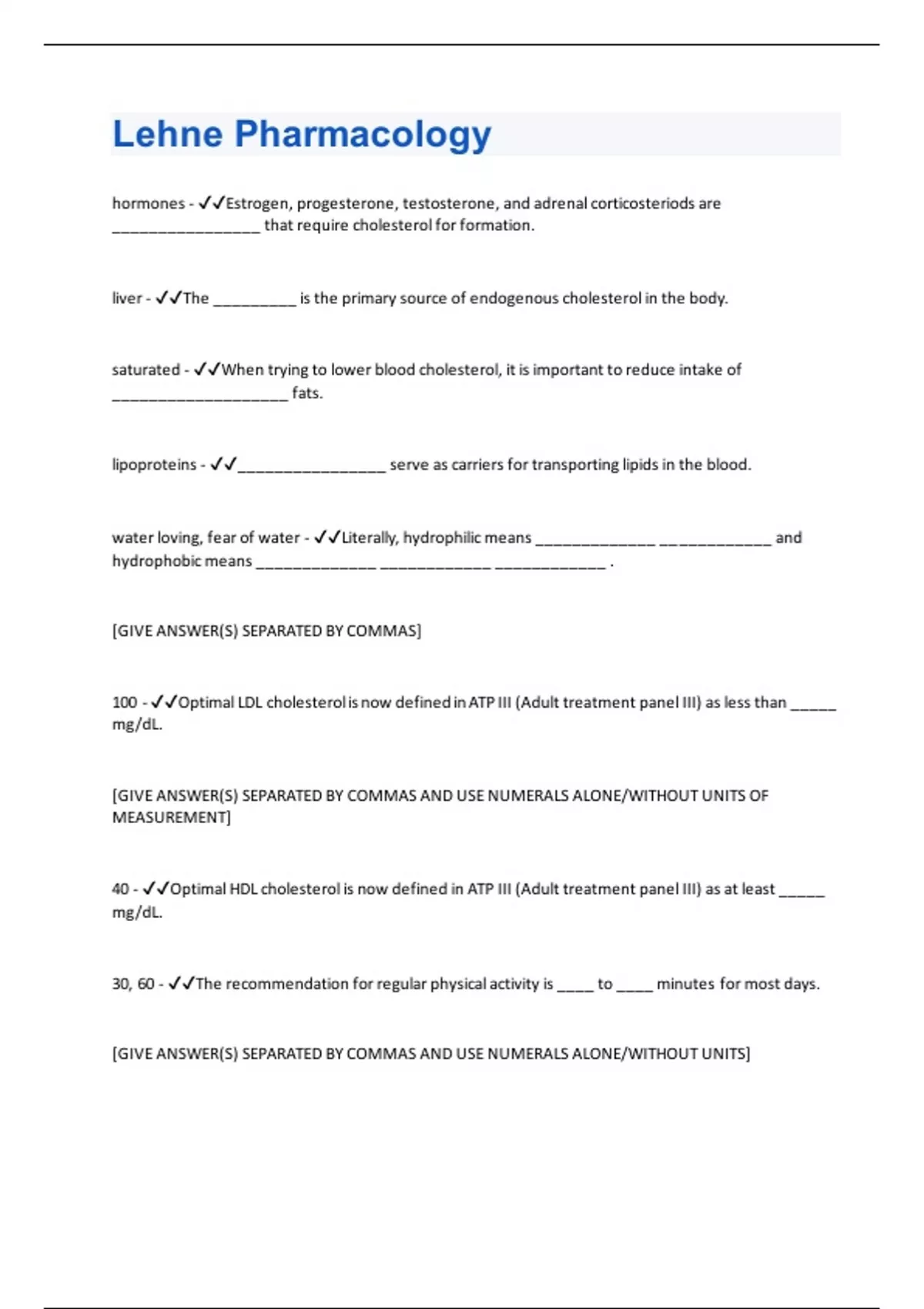 hormones - Estrogen, progesterone, testosterone, and adrenal corticosteriods are ________________ that require cholesterol for formation. liver - The _________ is the primary source of endogenous cholesterol in the body. saturated - When trying to lower blood cholesterol, it is important to reduce intake of ___________________ fats. lipoproteins - ________________ serve as carriers for transporting lipids in the blood. water loving, fear of water - Literally, hydrophilic means _____________ ____________ and hydrophobic means _____________ ____________ ____________ . [GIVE ANSWER(S) SEPARATED BY COMMAS] 100 - Optimal LDL cholesterol is now defined in ATP III (Adult treatment panel III) as less than _____ mg/dL. [GIVE ANSWER(S) SEPARATED BY COMMAS AND USE NUMERALS ALONE/WITHOUT UNITS OF MEASUREMENT] 40 - Optimal HDL cholesterol is now defined in ATP III (Adult treatment panel III) as at least _____ mg/dL. 30, 60 - The recommendation for regular physical activity is ____ to ____ minutes for most days. [GIVE ANSWER(S) SEPARATED BY COMMAS AND USE NUMERALS ALONE/WITHOUT UNITS]c - A 45-year old female smoker with a family history of coronary heart disease (CHD) has been prescribed a lipid-lowering medication. Which outcome would be most important for this patient? a) Cholesterol total less than 200 mg/dL b) HDL greater than 40 mg/dL c) LDL less than 100 mg/dL d) Triglycerides less than 150 mg/dL [GIVE ONLY THE LOWER CASE LETTER(S) FOR THE ANSWER] b - A patient has received instructions regarding cholesterol and the body. Which statement made by the patient would indicate the patient needs further teaching? a) "Drugs that decrease the liver's ability to produce cholesterol should be taken so that they peak during the night." b) "Drugs that prevent the absorption of cholesterol from food are more effective than drugs that limit the making of cholesterol by the liver." c) "It is more important to limit the amount of saturated fat in my diet than the total amount of cholesterol." d) "My cholesterol can be high even if I eat a low-fat diet and exercise regularly." [GIVE ONLY THE LOWER CASE LETTER(S) FOR THE ANSWER] a - Recent laboratory results for a patient include HDL 85 mg/dL, LDL 145 mg/dL, and triglycerides 630 mg/dL. The nurse should assess the patient for what? a) Upper abdominal pain and nausea b) Chest pain and shortness of breath c) Rash and pruritus d) Tachycardia and diaphoresis