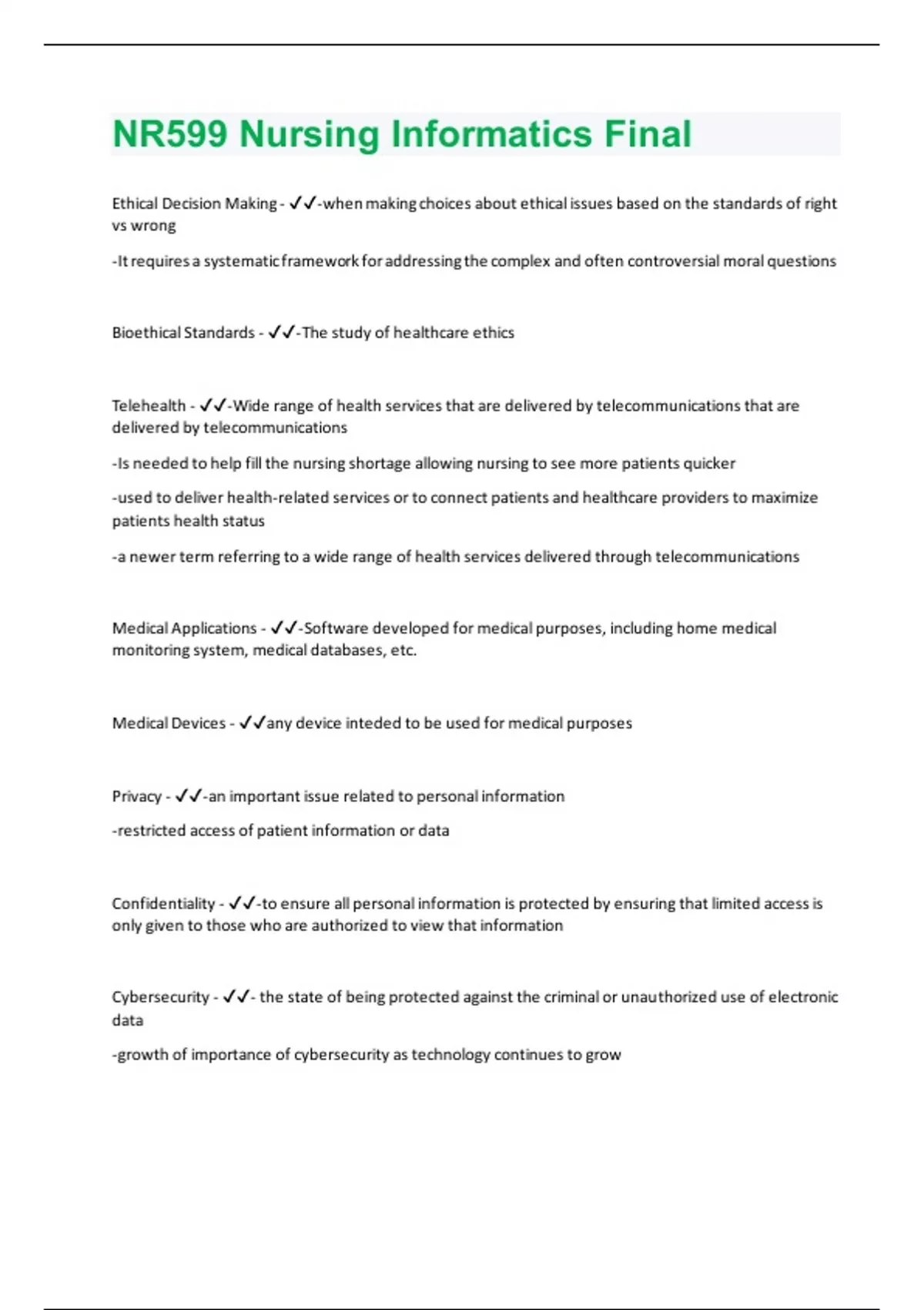 Ethical Decision Making - -when making choices about ethical issues based on the standards of right vs wrong -It requires a systematic framework for addressing the complex and often controversial moral questions Bioethical Standards - -The study of healthcare ethics Telehealth - -Wide range of health services that are delivered by telecommunications that are delivered by telecommunications -Is needed to help fill the nursing shortage allowing nursing to see more patients quicker -used to deliver health-related services or to connect patients and healthcare providers to maximize patients health status -a newer term referring to a wide range of health services delivered through telecommunications Medical Applications - -Software developed for medical purposes, including home medical monitoring system, medical databases, etc. Medical Devices - any device inteded to be used for medical purposes Privacy - -an important issue related to personal information -restricted access of patient information or data Confidentiality - -to ensure all personal information is protected by ensuring that limited access is only given to those who are authorized to view that information Cybersecurity - - the state of being protected against the criminal or unauthorized use of electronic data -growth of importance of cybersecurity as technology continues to growComputer aided translators - -a form of language translation in which a human translator uses computer hardware to support and facilitate the translation process