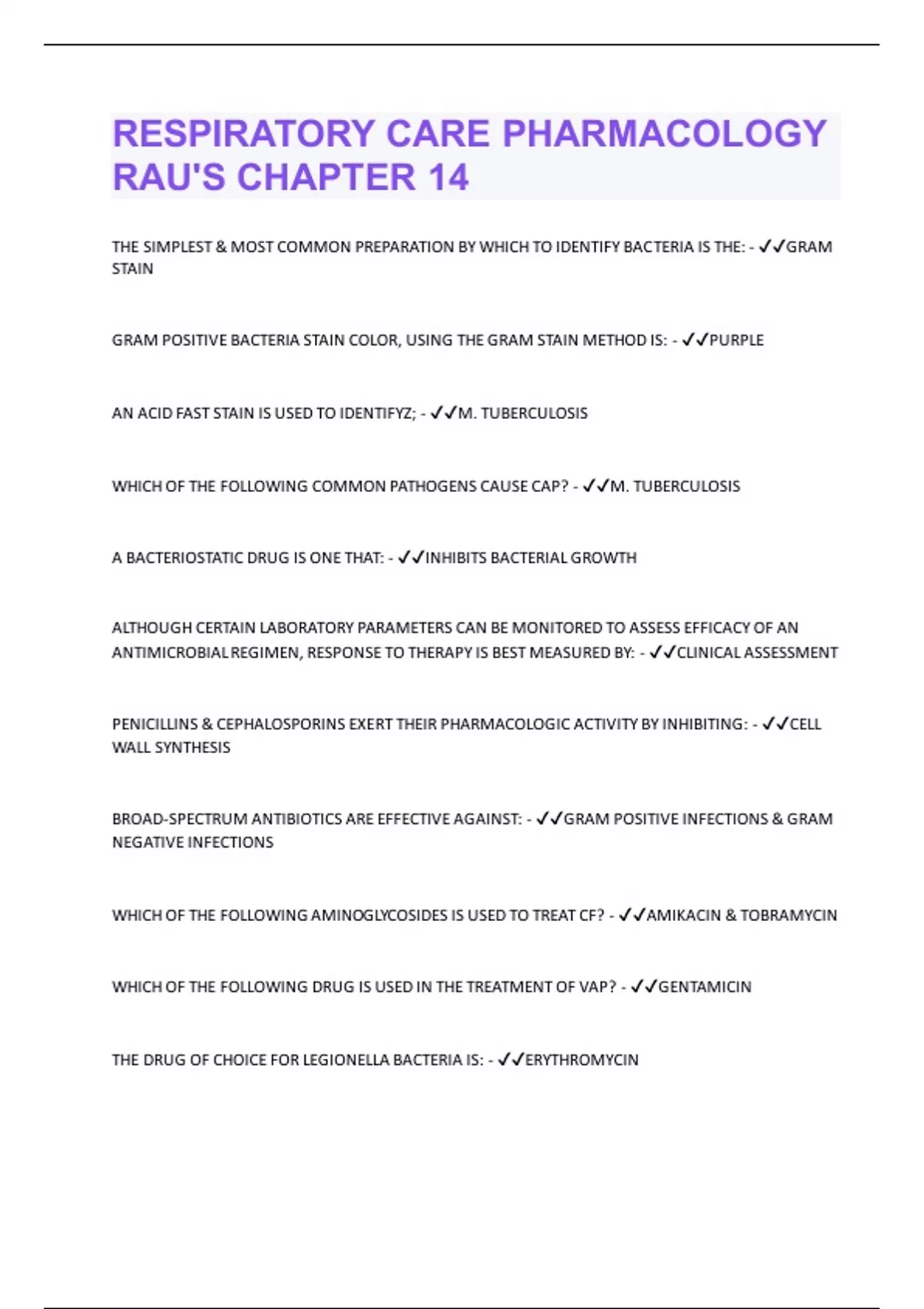 THE SIMPLEST & MOST COMMON PREPARATION BY WHICH TO IDENTIFY BACTERIA IS THE: - GRAM STAIN GRAM POSITIVE BACTERIA STAIN COLOR, USING THE GRAM STAIN METHOD IS: - PURPLE AN ACID FAST STAIN IS USED TO IDENTIFYZ; - M. TUBERCULOSIS WHICH OF THE FOLLOWING COMMON PATHOGENS CAUSE CAP? - M. TUBERCULOSIS A BACTERIOSTATIC DRUG IS ONE THAT: - INHIBITS BACTERIAL GROWTH ALTHOUGH CERTAIN LABORATORY PARAMETERS CAN BE MONITORED TO ASSESS EFFICACY OF AN ANTIMICROBIAL REGIMEN, RESPONSE TO THERAPY IS BEST MEASURED BY: - CLINICAL ASSESSMENT PENICILLINS & CEPHALOSPORINS EXERT THEIR PHARMACOLOGIC ACTIVITY BY INHIBITING: - CELL WALL SYNTHESIS BROAD-SPECTRUM ANTIBIOTICS ARE EFFECTIVE AGAINST: - GRAM POSITIVE INFECTIONS & GRAM NEGATIVE INFECTIONS WHICH OF THE FOLLOWING AMINOGLYCOSIDES IS USED TO TREAT CF? - AMIKACIN & TOBRAMYCIN WHICH OF THE FOLLOWING DRUG IS USED IN THE TREATMENT OF VAP? - GENTAMICIN THE DRUG OF CHOICE FOR LEGIONELLA BACTERIA IS: - ERYTHROMYCINMETHICILLIN-RESISTANT S. AEREUS (MRSA) IS BEST TREATED W/ WHICH DRUG? - VANCOMYCIN A PATIENT SUSPECTED OF HAVING TB SHOULD REMAIN IN AN ISOLATION ROOM UNTIL: - THE PATIENT IS DETERMINED NOT TO HAVE TB DRUG TREATMENT FOR TUBERCULOSIS CONSISTS OF MULTIPLE ANTIBIOTICS FOR: - 6 - 12 MONTHS NOSOCOMIAL TRANSMISSION CAN BE PREVENTED BY PLACING PATIENTS W/ SUSPECTED OR CONFIRMED TUBERCULOSIS IN: - RESPIRATORY ISOLATION INITIAL THERAPY FOR TREATMENT OF TB INVOLVES A COMBINATION OF: - ISONIAZID - PYRAZINAMIDE - RIFAMPIN - ETHAMBUTOL WHICH OF THE FOLLOWING PATHOGENS ARE COMMONLY RESPONSIBLE FOR CAP? - S. PNEUMONIAE - H. INFLUENZAE - M. PNEUMONAIE A SPUTUM CULTURE HAS RETURNED & SHOWS GRAM-NEGATIVE BACILLI (RODS) PRESENT. THIS RESULT WOULD INDICATE: - COLONIZATION